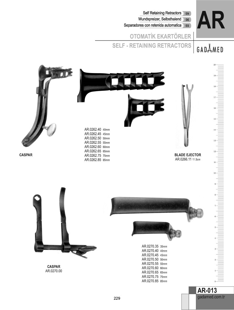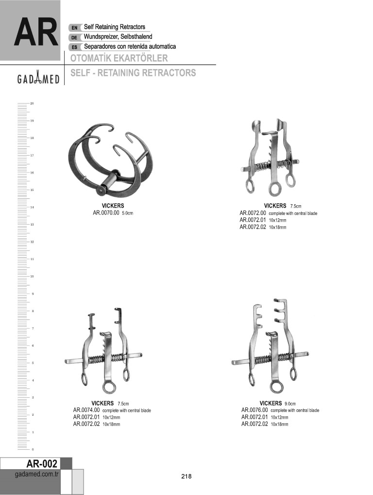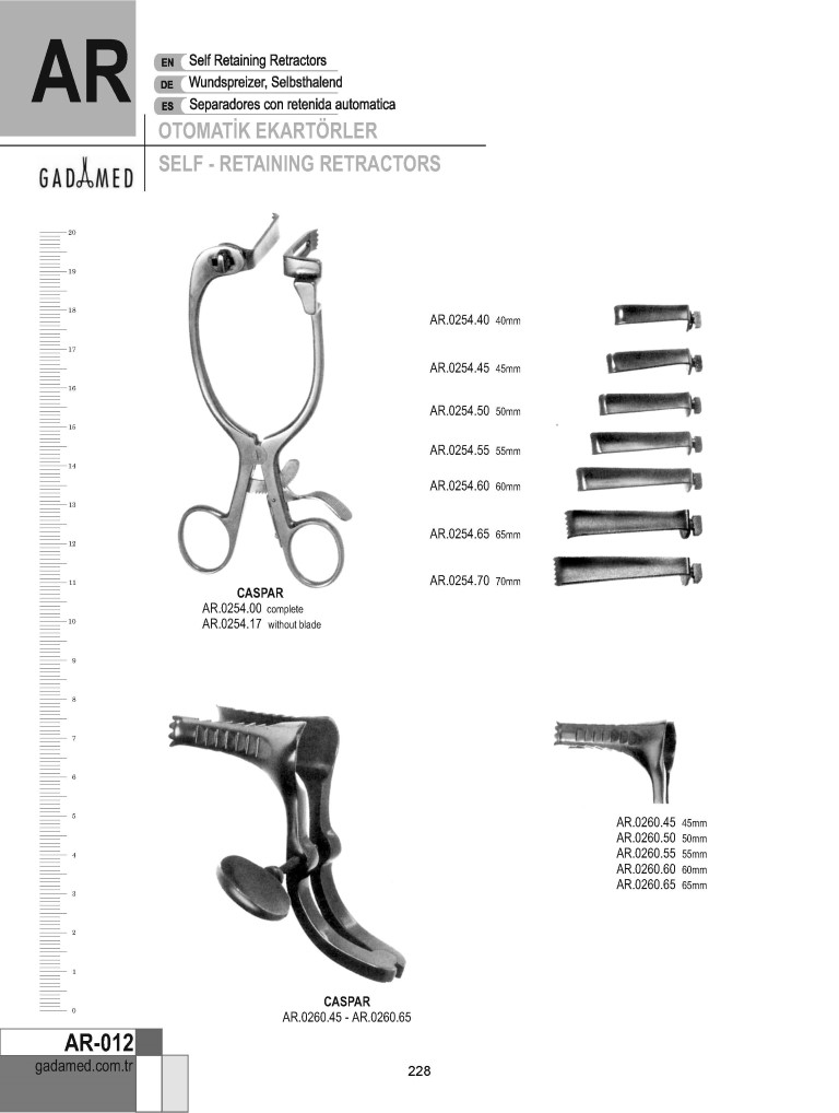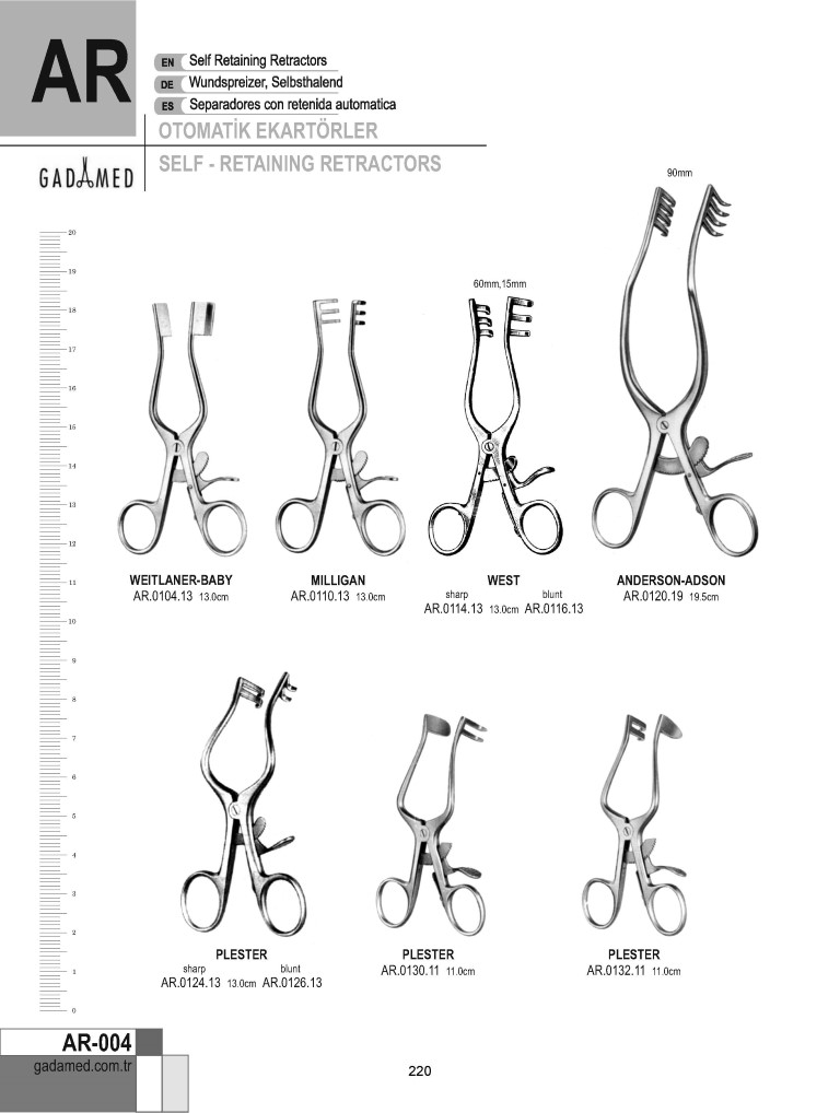 AR.0010.04 8681091028627 Otomatik ekartör, Logan model 3X3T, 4CM AR.0014.06 8681091028634 Otomatik ekartör, Buckley model cilt için keskin 3X3PR. 6CM AR.0020.08 8681091028641 Otomatik ekartör, cilt için 8.0 cm AR.0030.07 8681091028658 Otomatik ekartör, Alm model keskin 7CM AR.0030.10 8681091028665 Otomatik ekartör, Alm model keskin 10CM AR.0032.07 8681091028672 Otomatik ekartör, Alm model künt 7CM AR.0032.10 8681091028689 Otomatik ekartör, Alm model künt 10CM AR.0040.10 8681090891703 Otomatik ekartör, Kaupp model keskin 10.0 cm AR.0042.10 8681091028696 Otomatik ekartör, Kaupp model künt 10.0 cm AR.0050.05 8681091028702 Otomatik ekartör, Finsen model Keskin 3X3PR. 5CM AR.0050.07 8681091028719 Otomatik ekartör, Finsen model Keskin 7CM AR.0052.05 8681091028726 Otomatik ekartör, Finsen model künt 3X3PR. 5CM AR.0052.07 8681091028733 Otomatik ekartör, Finsen model künt 3X3PR. 7CM AR.0054.05 8681091028740 Otomatik ekartör, Finsen model Keskin W/SCREW 5CM AR.0054.07 8681091028757 Otomatik ekartör, Finsen model Keskin 7CM AR.0056.05 8681091028764 Otomatik ekartör, Finsen model künt W/SCREW 5CM AR.0056.07 8681091028771 Otomatik ekartör, Finsen model künt 7CM AR.0060.10 8681091028788 Otomatik ekartör,Jansen model keskin 3X3PR. 10CM AR.0062.10 8681091028795 Otomatik ekartör,Jansen model künt 3X3PR. 10CM AR.0070.00 8681091028801 Otomatik ekartör,Vickers model RİNG MODEL 5CM AR.0072.00 8681091028818 Otomatik ekartör, Vickers model komple AR.0072.01 8681091028825 Otomatik ekartör, Vickers model 12X10MM AR.0072.02 8681091028832 Otomatik ekartör, Vickers model 10X18MM AR.0074.00 8681091028849 Otomatik ekartör, Vickers model 10X12mm AR.0076.00 8681091028856 Otomatik ekartör, Vickers model UNİVERSAL HAND & CARPAL AR.0080.10 8681091028863 Otomatik ekartör, Weitlaner model keskin 2X3PR. 11.5CM AR.0082.10 8681091028870 Otomatik ekartör, Weitlaner model künt 2X3PR. 11.5CM AR.0084.13 8681091028887 Otomatik ekartör, Weitlaner model 3X4PR. SHARP 13CM AR.0084.14 8681091028894 Otomatik ekartör, Weitlaner model 3X4PR. SHARP 14CM AR.0084.16 8681091028900 Otomatik ekartör, Weitlaner model 3X4PR. SHARP 16.5CM AR.0086.13 8681091028917 Otomatik ekartör, Weitlaner model 3X4PR. BLUNT 13CM AR.0086.14 8681091028924 Otomatik ekartör, Weitlaner model 3X4PR. BLUNT 14CM AR.0086.16 8681091028931 Otomatik ekartör, Weitlaner model 3X4PR. BLUNT 16.5CM AR.0088.13 8681091028948 Otomatik ekartör, Weitlaner Wullstein model 3X4PR. SH. 13CM AR.0089.13 8681091028955 Otomatik ekartör, Weitlaner Wullstein model 3X4PR. BL. 13CM AR.0090.13 8681091028962 Otomatik ekartör, Weitlaner Wullstein model 3X3PR. SH. 13CM AR.0092.13 8681091028979 Otomatik ekartör, Weitlaner Wullstein model 3X3PR. BL. 13CM AR.0094.20 8681091028986 Otomatik ekartör, Weitlaner model 3X4PR. keskin 20CM AR.0094.23 8681091028993 Otomatik ekartör, Weitlaner model 3X4PR. keskin 23CM AR.0094.26 8681091029006 Otomatik ekartör, Weitlaner model 3X4PR. keskin 26CM AR.0096.20 8681091029013 Otomatik ekartör, Weitlaner model 3X4PR. keskin 20CM AR.0096.23 8681091029020 Otomatik ekartör, Weitlaner model 3X4PR. keskin 23CM AR.0096.26 8681091029037 Otomatik ekartör, Weitlaner model 3X4PR. keskin 26CM AR.0100.20 8681091029044 Otomatik ekartör, Travers model 4X5PR. 19X25 & 25X25MM, BL. 20CM AR.0100.21 8681091029051 Otomatik ekartör, Travers model 4X5PR. 19X25 & 25X25MM BL 21.5CM AR.0104.13 8681091029068 Otomatik ekartör, Weitlaner baby model SOLİD BLADE 13CM AR.0110.13 8681091029075 Otomatik ekartör, Milligan model 3X3PR. BLUNT 13CM AR.0114.13 8681091029082 Otomatik ekartör, west model keskin 13CM AR.0116.13 8681091029099 Otomatik ekartör, west model künt 13CM AR.0120.19 8681091029105 Otomatik ekartör, Anderson-adson model keskin 4X4PR. 19.5CM AR.0124.13 8681091029112 Otomatik ekartör, Plester model 2X2PR. SHARP 13CM AR.0126.13 8681091029129 Otomatik ekartör, Plester model 2X2PR. BLUNT 13CM AR.0130.11 8681091029136 Otomatik ekartör, Plester model 1X2PR. LEFT 11CM AR.0132.11 8681091029143 Otomatik ekartör, Plester model 1X2PR. RİGHT 11CM AR.0140.14 8681091029150 Otomatik ekartör, Scalp Contour model 3X4PR. keskin 14CM AR.0142.14 8681091029167 Otomatik ekartör, Scalp Contour model 3X4PR. künt 14CM AR.0150.16 8681091029174 Otomatik ekartör, Mollison model 4X4PR. SH 16.5CM AR.0152.15 8681091029181 Otomatik ekartör, Mollison model keskin 15CM AR.0156.18 8681091029198 Otomatik ekartör, Rigby model, Vajinal tip 18.0 cm AR.0160.17 8681091029204 Otomatik ekartör, Mayo-Adams model 17.0 cm AR.0162.17 8681091029211 Otomatik ekartör, Mayo-Adams model Central Bleyt 17CM AR.0170.18 8681091029228 Otomatik ekartör, Darling model CVD 57X38MM 18CM AR.0172.18 8681091029235 Otomatik ekartör, Darling modelCVD 57X38MM 18CM AR.0176.01 8681091029242 Otomatik ekartör, Henley model 3X4PR. SHARP 16.5CM AR.0176.02 8681091029259 Otomatik ekartör, Henley model 3X4PR. BLUNT 16.5CM AR.0176.19 8681091029266 Otomatik ekartör, Henley model bleyt 16X19MM AR.0176.25 8681091029273 Otomatik ekartör, Henley model bleyt16X25MM AR.0176.32 8681091029280 Otomatik ekartör, Henley model bleyt 16X32MM AR.0180.13 8681091029297 Otomatik ekartör, Gelpi-Loktite model 13CM AR.0182.09 8681091029303 Otomatik ekartör, Gelpi model 9CM AR.0182.14 8681091029310 Otomatik ekartör, Gelpi model 14CM AR.0182.16 8681091029327 Otomatik ekartör, Gelpi model 16CM AR.0182.18 8681091029334 Otomatik ekartör, Gelpi model 18CM AR.0186.18 8681091029341 Otomatik ekartör, Gelpi model stoplu 18CM AR.0190.15 8681091029358 Otomatik ekartör, Gelpi Seiletz model 15CM AR.0194.18 8681091029365 Otomatik ekartör, Gelpi Loktite model18CM AR.0196.18 8681091029372 Otomatik ekartör, Gelpi Loktite model 18CM AR.0200.22 8681091029389 Otomatik ekartör, Norfolk-Norwich model 4X5PR. BLUNT 51X215MM AR.0204.01 8681091029396 Otomatik ekartör, 6X6PR. SH, 27CM AR.0204.02 8681091029402 Otomatik ekartör, 6X6PR. SH, 27CM AR.0210.13 8681091029419 Otomatik ekartör, Adson model 3X4PR. keskin, 13CM 