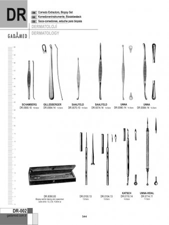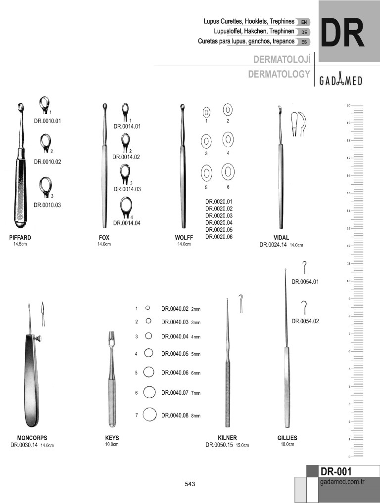 DR.0010.01 8681091062072 PİFFARD LUPUS KURET ŞEK.1 DR.0010.02 8681091062089 PİFFARD LUPUS KURET ŞEK.2 DR.0010.03 8681091062096 PİFFARD LUPUS KURET ŞEK.3 DR.0014.01 8681091062102 FOX LUPUS KURET 3MM 14CM DR.0014.02 8681091062119 FOX LUPUS KURET 4MM 14CM DR.0014.03 8681091062126 FOX LUPUS KURET 5MM 14CM DR.0014.04 8681091062133 FOX LUPUS KURET 6MM 14CM DR.0020.01 8681091062140 WOLFF LUPUS KURET 14CM ŞEK.1 DR.0020.02 8681091062157 WOLFF LUPUS KURET 14CM ŞEK.2 DR.0020.03 8681091062164 WOLFF LUPUS KURET 14CM ŞEK.3 DR.0020.04 8681091062171 WOLFF LUPUS KURET 14CM ŞEK.4 DR.0020.05 8681091062188 WOLFF LUPUS KURET 14CM ŞEK.5 DR.0020.06 8681091062195 WOLFF LUPUS KURET 14CM ŞEK.6 DR.0024.14 8681091062201 VIDAL LUPUS KURET 14CM DR.0030.14 8681091062218 MONCORPS MİLİUM BIÇAK, SABİTLEME VİDALI 14 CM DR.0040.02 8681091062225 KEYES DERMAL PANÇ 2MM DR.0040.03 8681091062232 KEYES DERMAL PANÇ 3MM DR.0040.04 8681091062249 KEYES DERMAL PANÇ 4MM DR.0040.05 8681091062256 KEYES DERMAL PANÇ 5MM DR.0040.06 8681091062263 KEYES DERMAL PANÇ 6MM DR.0040.07 8681091062270 KEYES DERMAL PANÇ 7MM DR.0040.08 8681091062287 KEYES DERMAL PANÇ 8MM DR.0050.15 8681091062294 KILNER DERİ KANCASI 15CM DR.0054.01 8681091062300 GILLIES HASSAS KANCA ŞEK.1, 18CM DR.0054.02 8681091062317 GILLIES HASSAS KANCA ŞEK.2, 18CM DR.0060.10 8681091062324 SCHAMBERG COMEDICONO EKSTRAKTÖR ÇİFT 10CM DR.0064.14 8681091062331 GİLLESBERGER COMEDICONO EKSTRAKTÖR 14.5CM DR.0070.10 8681091062348 SAALFELD COMEDICONO EKSTRAKTÖR 10CM DR.0074.14 8681091062355 SAALFELD COMEDICONO EKSTRAKTÖR İĞNELİ 14CM DR.0080.14 8681091062362 UNNA COMEDICONO EKSTRAKTÖR ÇİFT 14CM DR.0084.14 8681091062379 UNNA COMEDICONO EKSTRAKTÖR ÇİFT 14CM DR.0090.00 8681091062386 KOMPLE BİYOPSİ SETİ, ÇANTADA DR.0100.13 8681091062393 MİLİUM İĞNE KAPAKLI 13CM DR.0104.13 8681091062409 COMEDICONO KORUYUCULU EKSTRAKSİYON İĞNESİ 13CM DR.0110.14 8681091062416 KATSCH/WALTON COMEDICONO EKSTRAKTÖR 14CM DR.0114.11 8681091062423 UNNA-VİDAL COMEDICONO EKSTRAKTÖR İĞNELİ 11.5CM