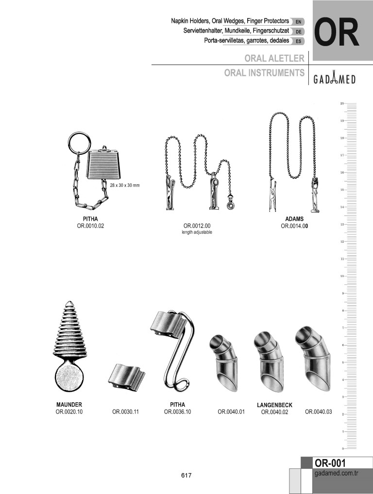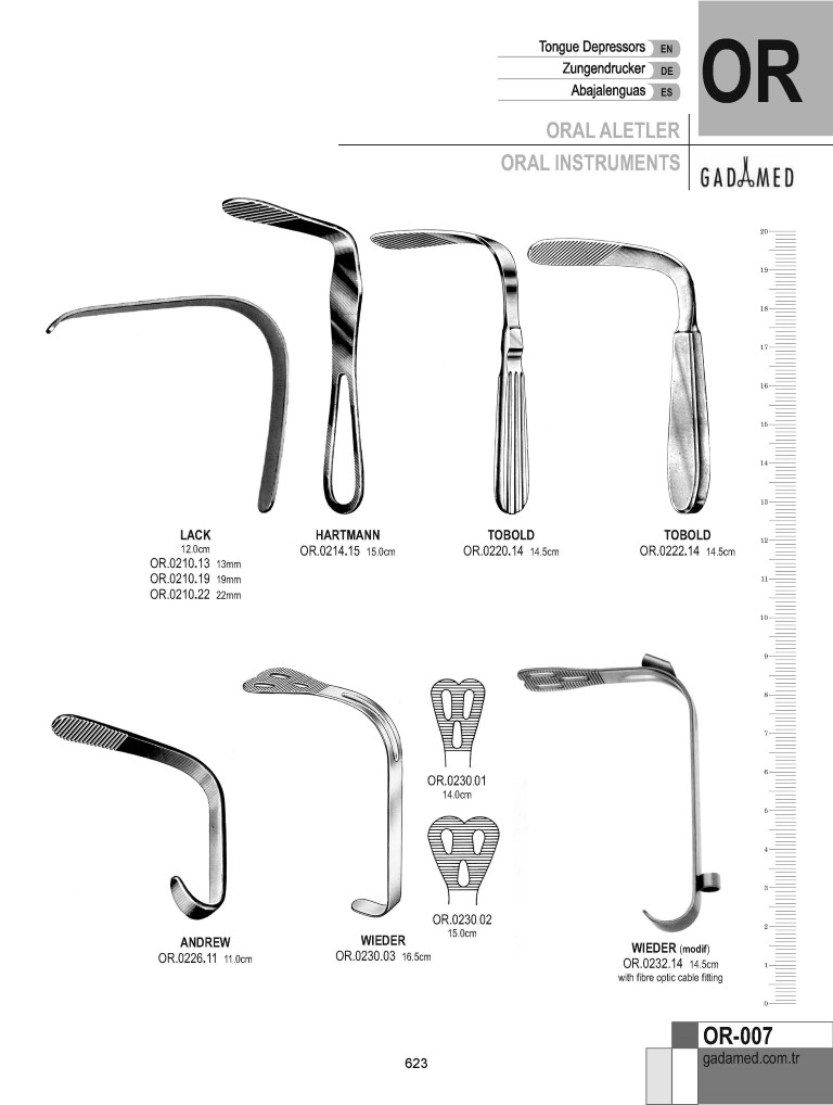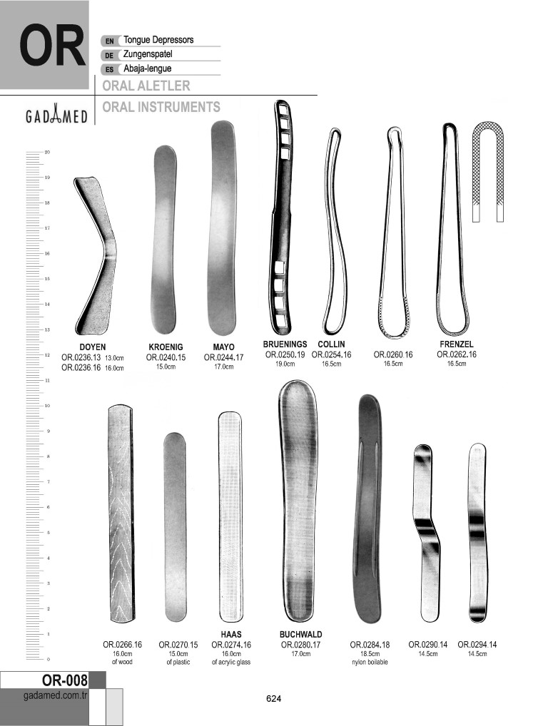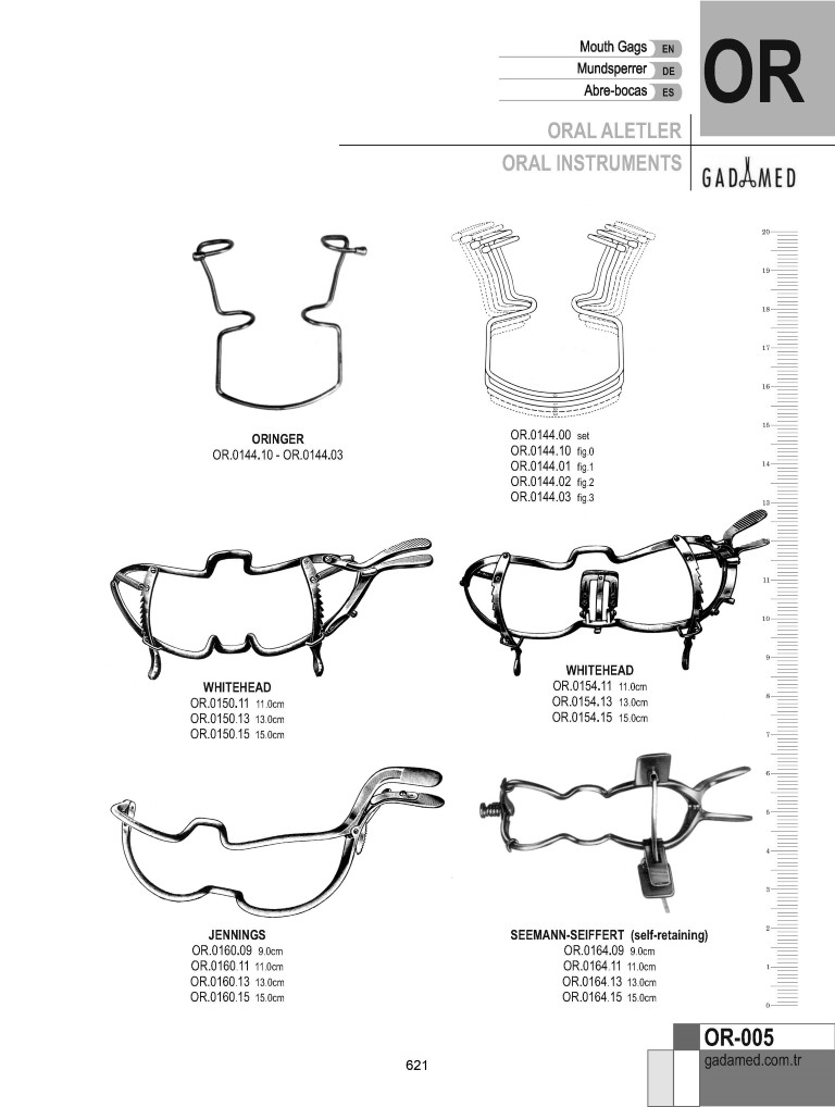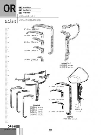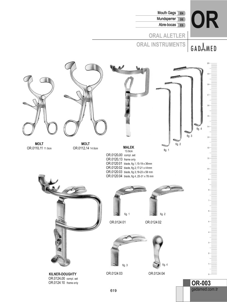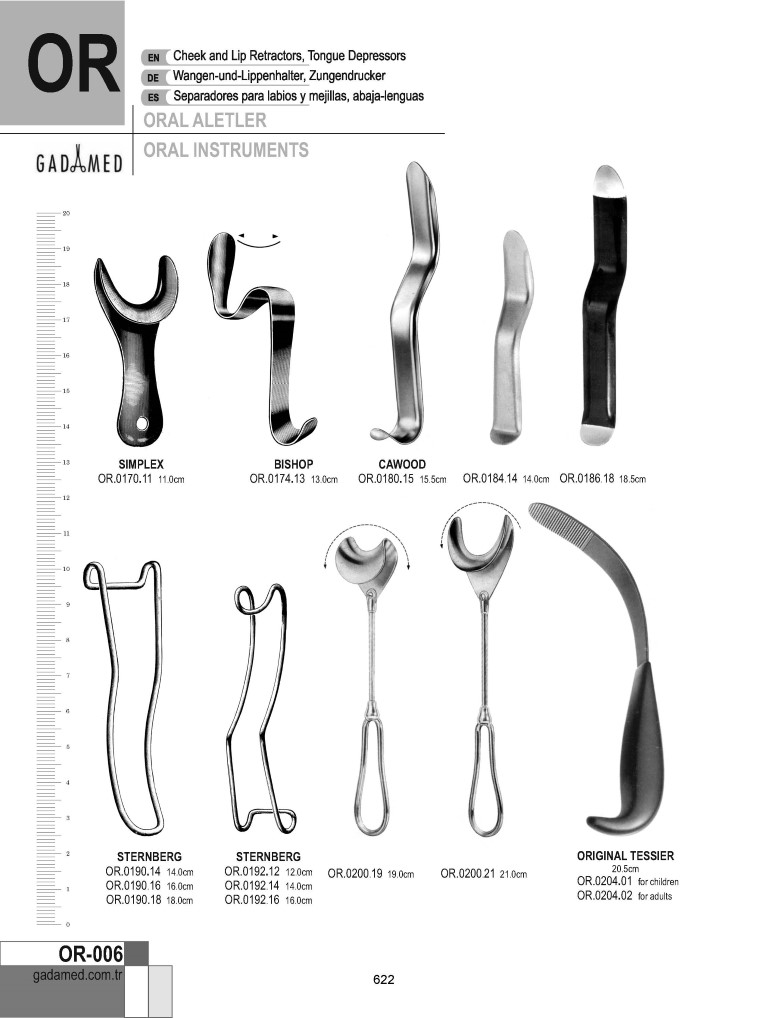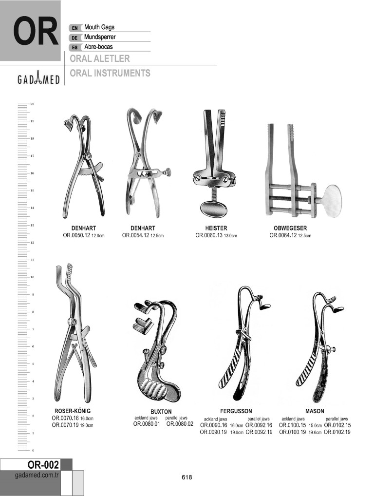OR.0010.02 8681091070947 ZİNCİRLİ PLASTİK KAMA OR.0012.00 8681091070954 AYARLANABİLİR METAL ZİNCİR İLE MENDİL TUTUCULAR OR.0014.00 8681091070961 AYARLANABİLİR METAL ZİNCİR İLE ADEM ELMASI TUTUCULAR OR.0020.10 8681091070978 MAUNDE RORAL VİDA AHŞAP OR.0030.11 8681091070985 YEDEK PLASTİK KAMA OR.0036.10 8681091070992 PİTHA ORAL KAMA, SİLİKON LASTİK OR.0040.01 8681091071005 LANGENBECK PARMAK KORUMASI ŞEK.1 OR.0040.02 8681091071012 LANGENBECK PARMAK KORUMASI ŞEK.2 OR.0040.03 8681091071029 LANGENBECK PARMAK KORUMASI ŞEK.3 OR.0050.12 8681091071036 DENHART AĞIZ AÇACAĞI 12CM OR.0054.12 8681091071043 DENHART AĞIZ AÇACAĞI 12.5CM OR.0060.13 8681091071050 HEISTER AĞIZ AÇACAĞI DÜZ 13CM OR.0064.12 8681091071067 OBWEGESER 12.5 CM ORAL OR.0070.16 8681091071074 ROSER-KONİG AĞIZ AÇACAĞI 16CM OR.0070.19 8681091071081 ROSER-KONİG AĞIZ AÇACAĞI 19CM OR.0080.01 8681091071098 BUXTON AĞIZ AÇACAĞI ACKLAND ÇENE OR.0080.02 8681091071104 BUXTON AĞIZ AÇACAĞI PARALEL ÇENE OR.0090.16 8681091071111 FERGUSSON AĞIZ AÇACAĞI ACKLAND ÇENE 16CM OR.0090.19 8681091071128 FERGUSSON AĞIZ AÇACAĞI ACKLAND ÇENE 19CM OR.0092.16 8681091071135 FERGUSSON AĞIZ AÇACAĞI PARALEL ÇENE 16CM OR.0092.19 8681091071142 FERGUSSON AĞIZ AÇACAĞI PARALEL ÇENE 19CM OR.0100.15 8681091071159 MASON AĞIZ AÇACAĞI ACKLAND ÇENE 15CM OR.0100.19 8681091071166 MASON AĞIZ AÇACAĞI ACKLAND ÇENE 19CM OR.0102.15 8681091071173 MASON AĞIZ AÇACAĞI PARALEL ÇENE 15CM OR.0102.19 8681091071180 MASON AĞIZ AÇACAĞI PARALEL ÇENE 19CM OR.0110.11 8681091071197 MOLT DOYEN JANSEN AĞIZ AÇACAĞI 12CM OR.0112.14 8681091071203 MOLT DOYEN JANSEN AĞIZ AÇACAĞI 14CM OR.0120.00 8681091071210 MALEK AĞIZ AÇACAĞI PEDİATRİK, 4 DİL PLAKASI İLE OR.0120.01 8681091071227 MALEK DİL PLAKASI 15-19X36MM, ŞEK.1 OR.0120.02 8681091071234 MALEK DİL PLAKASI 17-21X44MM, ŞEK.2 OR.0120.03 8681091071241 MALEK DİL PLAKASI 19-23X59MM, ŞEK.3 OR.0120.04 8681091071258 MALEK DİL PLAKASI 25-31X78MM, ŞEK.4 OR.0120.13 8681091071265 MALEK PEDİATRİK AĞIZ AÇACAĞI İÇİN YALNIZCA GÖVDE 13CM OR.0124.00 8681091071272 3 PLAKA İLE KOMPLE KILNER DOUGHTY AĞIZ AÇACAĞI OR.0124.01 8681091071289 KILNER DOUGHTY AĞIZ AÇACAĞI İÇİN DİL PLAKASI ŞEK.1 OR.0124.02 8681091071296 KILNER DOUGHTY AĞIZ AÇACAĞI İÇİN DİL PLAKASI ŞEK.2 OR.0124.03 8681091071302 KILNER DOUGHTY AĞIZ AÇACAĞI İÇİN DİL PLAKASI ŞEK.3 OR.0124.04 8681091071319 DİŞSİZLER İÇİN PALATAL DESTEĞİ ŞEK.4 OR.0124.10 8681091071326 SADECE KILNER DOUGHTY AĞIZ AÇACAĞI GÖVDESİ OR.0130.00 8681091071333 DAVIS BOYLE KOMPLE AĞIZ AÇACAK SETİ OR.0130.01 8681091071340 DAVIS BOYLE İÇİN DİL PLAKASI ŞEK.1, 27X105MM OR.0130.02 8681091071357 DAVIS BOYLE İÇİN DİL PLAKASI ŞEK.2, 25X90MM OR.0130.03 8681091071364 DAVIS BOYLE İÇİN DİL PLAKASI ŞEK.3, 25X75MM OR.0130.04 8681091071371 DAVIS BOYLE İÇİN DİL PLAKASI ŞEK.4, 22X60MM OR.0130.05 8681091071388 DAVIS BOYLE İÇİN DİL PLAKASI ŞEK.5, 20X25MM OR.0130.10 8681091071395 YALNIZCA DAVIS BOYLE AĞIZ AÇACAĞI GÖVDESİ (YETİŞKİN) OR.0130.99 8681090993612 Davis Boyle Model Ağız açacağı gövdesi yet. için OR.0132.10 8681090994404 Davis Boyle Model Ağız açacağı gövdesi çoc. için OR.0134.00 8681091071401 DINGMAN YARIK PALATI ONARIMI İÇİN AĞIZ AÇACAĞI SETİ OR.0134.01 8681091071418 SADECE DINGMAN AĞIZ AÇACAĞI İÇİN BIÇAK ŞEK. 1 OR.0134.02 8681091071425 SADECE DINGMAN AĞIZ AÇACAĞI İÇİN BIÇAK ŞEK. 2 OR.0134.03 8681091071432 SADECE DINGMAN AĞIZ AÇACAĞI İÇİN BIÇAK ŞEK. 3 OR.0134.10 8681091071449 DINGMAN 2 ADET YANAK RET. İLE AĞIZ AÇACAĞI OR.0140.00 8681091071456 MCIVOR AĞIZ AÇACAĞI KOMPLE OR.0140.01 8681091071463 "MCIVOR" İÇİN DİL PLAKASI 27X95MM, ŞEK.1 OR.0140.02 8681091071470 "MCIVOR" İÇİN DİL PLAKASI 22X85MM, ŞEK.2 OR.0140.03 8681091071487 "MCIVOR" İÇİN DİL PLAKASI 22X70MM, ŞEK.3 OR.0140.10 8681091071494 SADECE MCIVOR AĞIZ AÇACAĞI GÖVDESİ OR.0144.00 8681091071500 ORINGER KENDİNDEN SABİTLEMELİ YANAK ve DUDAK RET. SETİ OR.0144.01 8681091071517 ORINGER KENDİNDEN SABİTLEMELİ YANAK ve DUDAK RET. ŞEK.1 OR.0144.02 8681091071524 ORINGER KENDİNDEN SABİTLEMELİ YANAK ve DUDAK RET. ŞEK.2 OR.0144.03 8681091071531 ORINGER KENDİNDEN SABİTLEMELİ YANAK ve DUDAK RET. ŞEK.3 OR.0144.10 8681091071548 ORINGER KENDİNDEN SABİTLEMELİ YANAK ve DUDAK RET. ŞEK.0 OR.0150.11 8681091071555 WHITEHEAD AĞIZ AÇACAĞI 11CM OR.0150.13 8681091071562 WHITEHEAD AĞIZ AÇACAĞI 13CM OR.0150.15 8681091071579 WHITEHEAD AĞIZ AÇACAĞI 15CM OR.0154.11 8681091071586 WHITEHEAD AĞIZ AÇACAĞI 11CM W.T.D OR.0154.13 8681091071593 WHITEHEAD AĞIZ AÇACAĞI 13CM W.T.D OR.0154.15 8681091071609 WHITEHEAD AĞIZ AÇACAĞI 15CM W.T.D OR.0160.09 8681091071616 JENNING AĞIZ AÇACAĞI 9CM OR.0160.11 8681091071623 JENNING AĞIZ AÇACAĞI 11CM OR.0160.13 8681091071630 JENNING AĞIZ AÇACAĞI 13CM OR.0160.15 8681091071647 JENNING AĞIZ AÇACAĞI 15CM OR.0164.09 8681091071654 SEEMANN SEIFFERTR AĞIZ AÇACAĞI 9CM OR.0164.11 8681091071661 SEEMANN SEIFFERTR AĞIZ AÇACAĞI 11CM OR.0164.13 8681091071678 SEEMANN SEIFFERTR AĞIZ AÇACAĞI 13CM OR.0164.15 8681091071685 SEEMANN SEIFFERTR AĞIZ AÇACAĞI 15CM OR.0170.11 8681091071692 MARTIN SIMPLEX YANAK EKARTÖRÜ 11CM OR.0174.13 8681091071708 BISHOP YANAK ve DUDAK EKARTÖRÜ D/E 22MM, 13CM OR.0180.15 8681091071715 CAWOOD YANAK EKARTÖRÜ 15.5CM OR.0184.14 8681091071722 UNIVERSITY OF MINNESOTA YANAK EKARTÖRÜ 14CM OR.0186.18 8681091071739 YANAK EKARTÖRÜ YALITIMLI 18.5CM OR.0190.14 8681091071746 STERNBERG DUDAK EKARTÖRÜ 14CM OR.0190.16 8681091071753 STERNBERG DUDAK EKARTÖRÜ 16CM OR.0190.18 8681091071760 STERNBERG DUDAK EKARTÖRÜ 18CM OR.0192.12 8681091071777 STERNBERG YANAK ve DUDAK EKARTÖRÜ 12CM OR.0192.14 8681091071784 STERNBERG YANAK ve DUDAK EKARTÖRÜ 14CM OR.0192.16 8681091071791 STERNBERG YANAK ve DUDAK EKARTÖRÜ 16CM OR.0200.19 8681091071807 KAYARLI BIÇAK İLE YANAK EKARTÖRÜ 35MM, 19CM OR.0200.2