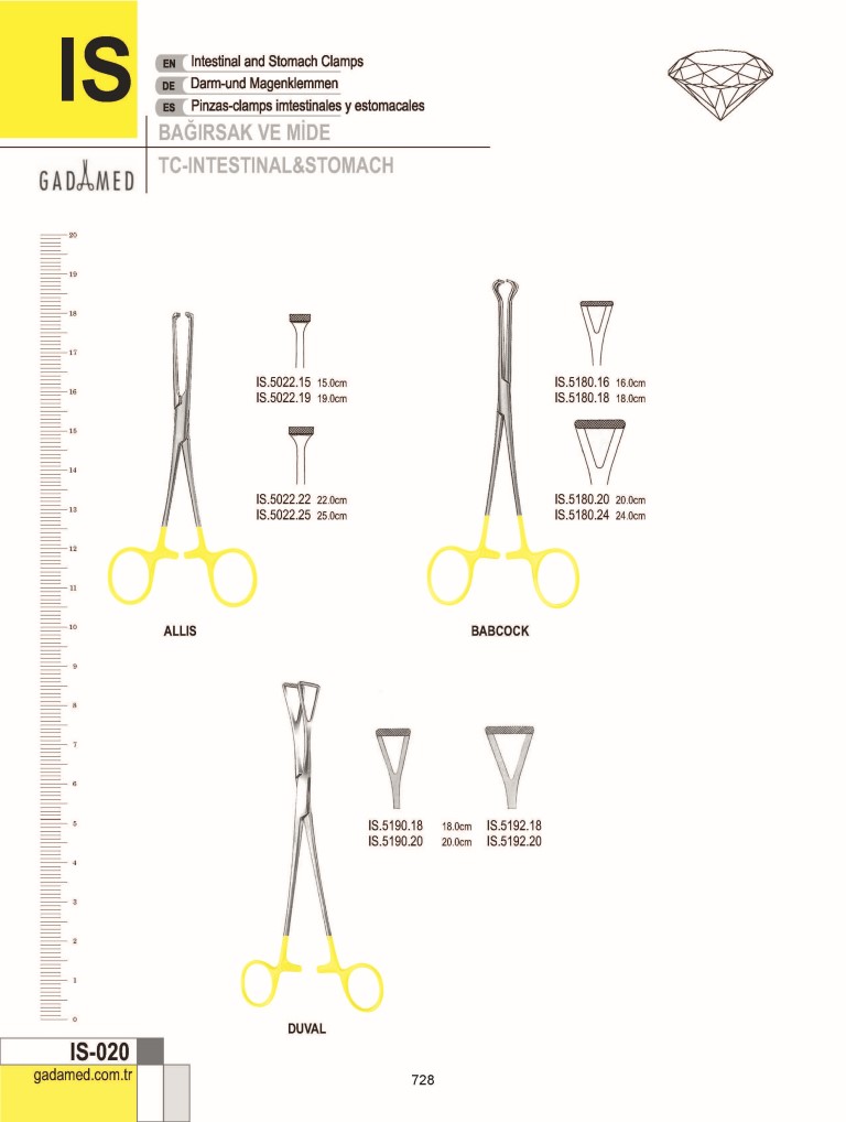 IS.0010.12 8681091078707 Allis Bebek Doku Forsepsi 4x5T 12cm IS.0020.15 8681091078714 Allis Doku Forsepsi 4x5T, 15cm IS.0020.19 8681091078721 Allis Doku Forsepsi 4x5T, 19cm IS.0020.22 8681091078738 Allis Doku Forsepsi 4x5T, 22cm IS.0020.25 8681091078745 Allis Doku Forsepsi 4x5T, 25cm IS.0022.15 8681091078752 Allis Doku Forsepsi 5x6T 15cm IS.0022.19 8681091078769 Allis Doku Forsepsi 5x6T 19cm IS.0022.22 8681091078776 Allis Doku Forsepsi 5x6T 22cm IS.0022.25 8681091078783 Allis Doku Forsepsi 5x6T 24cm IS.0030.15 8681091078790 Boys Allis İntesinal Doku Forsepsi 15cm IS.0040.15 8681091078806 Allis Adair Doku Forsepsi 9x10T 15.5cm IS.0050.15 8681091078813 Judd-Allis Doku Forsepsi 3x4T 15cm IS.0050.19 8681091078820 Judd-Allis Doku Forsepsi 3x4T 19cm IS.0060.16 8681091078837 Allis Doku Forsepsi Atravmatik 16cm IS.0060.20 8681091078844 Allis Doku Forsepsi Atravmatik 20cm IS.0060.25 8681091078851 Allis Doku Forsepsi Atravmatik 25cm IS.0060.30 8681091078868 Allis Doku Forsepsi Atravmatik 30cm IS.0070.20 8681091078875 Thomas Allis Doku Forsepsi 6x7T 20cm IS.0080.20 8681091078882 Allis Doku Forsepsi 5x6T 20cm IS.0090.20 8681091078899 Lockwood İntestinal Kavrama Forsepsi 20cm IS.0100.16 8681091078905 Williams Kavrama Forsepsi 16.5cm IS.0110.16 8681091078912 Lockwood Allis İntesinal Doku Forsepsi 16cm IS.0110.20 8681091078929 Lockwood Allis İntesinal Doku Forsepsi 20cm IS.0120.19 8681091078936 Littlewood Doku (Moynihan) Forsepsi 2X3T 19cm IS.0130.12 8681091078943 Lane Doku Forsepsi S/J 12.5cm IS.0130.15 8681091078950 Lane Doku Forsepsi S/J 15cm IS.0130.19 8681091078967 Lane Doku Forsepsi S/J 19cm IS.0134.12 8681091078974 Lane Doku Forsepsi 12.5cm IS.0134.15 8681091078981 Lane Doku Forsepsi 15cm IS.0134.19 8681091078998 Lane Doku Forsepsi B/J 19cm IS.0140.12 8681091079001 Porrier Doku Forsepsi 12.5cm IS.0140.18 8681091079018 Porrier Doku Forsepsi 18cm IS.0150.00 8681091079025 Sadece 52.0150.24 için lastik (çift) IS.0150.24 8681091079032 Çocuk İntestinal Tutma Forsepsi 24cm IS.0160.18 8681091079049 Denis Browne İntestinal Tutma Forsepsi 18cm IS.0170.21 8681091079056 Young İntestinal Tutma Forsepsi 21cm IS.0180.16 8681091079063 Babcock Doku Forsepsi Uzun tırtıklı 16cm IS.0180.18 8681091079070 Babcock Doku Forsepsi Uzun tırtıklı 18cm IS.0180.20 8681091079087 Babcock Doku Forsepsi Uzun tırtıklı 20cm IS.0180.24 8681091079094 Babcock Doku Forsepsi Uzun tırtıklı 24cm IS.0182.16 8681091079100 Babcock Doku Forsepsi çapraz tırtıklı 16cm IS.0182.18 8681091079117 Babcock Doku Forsepsi çapraz tırtıklı 18cm IS.0182.20 8681091079124 Babcock Doku Forsepsi çapraz tırtıklı 20cm IS.0182.24 8681091079131 Babcock Doku Forsepsi çapraz tırtıklı 24cm IS.0184.16 8681091079148 Babcock Doku Forsepsi Atravmatik 16cm IS.0184.20 8681091079155 Babcock Doku Forsepsi Atravmatik 20cm IS.0190.18 8681091079162 Duval Kavrama Forsepsi 13mm genişlik, 18cm IS.0190.20 8681091079179 Duval Kavrama Forsepsi 13mm genişlik, 20cm IS.0190.23 8681091079186 Duval Kavrama Forsepsi 13mm, 23cm IS.0192.18 8681091079193 Duval Kavrama Forsepsi 25mm genişlik, 18cm IS.0192.20 8681091079209 Duval Kavrama Forsepsi 25mm genişlik, 20cm IS.0192.23 8681091079216 Duval Kavrama Forsepsi 25mm genişlik, 23cm IS.0200.18 8681091079223 Doyen bebek İntestinal Forsepsi düz 18cm IS.0201.18 8681091079230 Doyen Bebek İntestinal Forsepsi kavisli 18cm IS.0204.21 8681091079247 Doyen İntestinal Forsepsi düz 21cm IS.0204.23 8681091079254 Doyen İntestinal Forsepsi düz 23cm IS.0205.21 8681091079278 Doyen İntestinal Forsepsi kavisli 21cm IS.0205.23 8681091079285 Doyen İntestinal Forsepsi kavisli 23cm IS.0210.21 8681091079308 Mayo Robson İntestinal klemp düz 21cm IS.0210.23 8681091079315 Mayo Robson İntestinal klemp düz 23cm IS.0210.25 8681091079322 Mayo Robson İntestinal klemp düz 25cm IS.0211.21 8681091079339 Mayo Robson İntestinal klemp kavisli 21cm IS.0211.23 8681091079346 Mayo Robson İntestinal klemp kavisli 23cm IS.0211.25 8681091079353 Mayo Robson İntestinal klemp kavisli 25cm IS.0220.15 8681091079360 Allen İntestinal Klemp düz tırtıklı, 1x2T ile 15.5cm IS.0230.12 8681091079377 KLeibingernschmidt Apandis Forsepti 12.5cm IS.0240.08 8681091079384 Mikulicz İntestinal Klemp 8x19cm IS.0240.12 8681091079391 Mikulicz İntestinal Klemp 12x19cm IS.0250.24 8681091079407 Brunner İntestinal Forsepsi 24cm IS.0260.25 8681091079414 Scudder İntestinal klemp pürüzsüz 25cm IS.0260.33 8681091079421 Scudder İntestinal klemp pürüzsüz düz 33cm IS.0261.25 8681091079438 Scudder İntestinal klemp pürüzsüz kavisli 25cm IS.0261.33 8681091079445 Scudder İntestinal klemp pürüzsüz kavisli 33cm IS.0270.36 8681091079452 Scudder İntestinal klemp düz 36cm IS.0271.36 8681091079469 Scudder İntestinal klemp kavisli 36cm IS.0280.29 8681091079476 Moynihan İntest. Klemp Fenestre düz 29cm IS.0281.29 8681091079483 Moynihan İntest. Klemp Fenestre kavisli 29cm IS.0290.22 8681091079490 Kocher İntestinal Forsepsi düz 22cm IS.0290.25 8681091079506 Kocher İntestinal Forsepsi düz 25cm IS.0290.28 8681091079513 Kocher İntestinal Forsepsi düz 28cm IS.0291.22 8681091079520 Kocher İntestinal Forsepsi kavisli 22cm IS.0291.25 8681091079537 Kocher İntestinal Forsepsi kavisli 25cm IS.0291.28 8681091079544 Kocher İntestinal Forsepsi kavisli 28cm IS.0300.16 8681091079551 Doyen İntestinal Forsepsi Atravma 16cm IS.0300.18 8681091079568 Doyen İntestinal Forsepsi Atravma 18cm IS.0300.21 8681091079575 Doyen İntestinal Forsepsi Atravma 21cm IS.0300.23 8681091079582 Doyen İntestinal Forsepsi Atravma 23cm IS.0301.16 8681091079599 Doyen İntestinal Forsepsi Atravma 16cm IS.0301.18 8681091079605 Doyen İntestinal Forsepsi Atravma 18cm IS.0301.21 8681091079612 Doyen İntestinal Forsepsi Atravma 21cm IS.0301.23 8681091079629 Doyen İntestinal Forsepsi Atravma 23cm IS.0310.22 8681091079636 Kocher İntestinal Forsepsi Atravma 22cm IS.0310.25 8681091079643 Kocher İntestinal Forsepsi Atravma 25cm IS.0310.28 8681091079650 Kocher İntestinal Forsepsi At