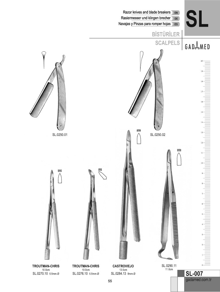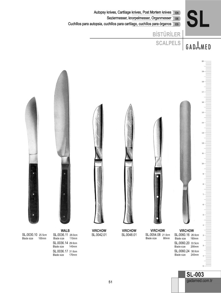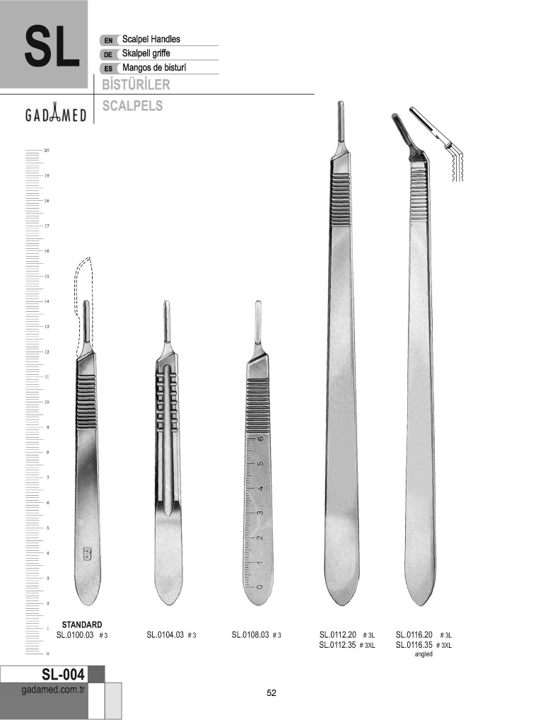 SL.0010.01 8681091005758 Diseksiyon Bıçağı fig.1 SL.0010.02 8681091005765 Diseksiyon Bıçağı fig.2 SL.0010.03 8681091005772 Diseksiyon Bıçağı fig.3 SL.0010.04 8681091005789 Diseksiyon Bıçağı fig.4 SL.0010.05 8681091005796 Diseksiyon Bıçağı fig.5 SL.0010.06 8681091005802 Diseksiyon Bıçağı fig.6 SL.0010.07 8681091005819 Diseksiyon Bıçağı fig.7 SL.0010.08 8681091005826 Diseksiyon Bıçağı fig.8 SL.0010.09 8681091005833 Diseksiyon Bıçağı fig.9 SL.0010.10 8681091005840 Diseksiyon Bıçağı fig.10 SL.0016.01 8681091005857 Diseksiyon Bıçağı SL.0020.01 8681091005864 Operasyon Bıçağı, Collin model fig.1 SL.0020.02 8681091005871 Operasyon Bıçağı, Collin model fig.2 SL.0020.03 8681091005888 Operasyon Bıçağı, Collin model fig.3 SL.0020.04 8681091005895 Operasyon Bıçağı, Collin model fig.4 SL.0020.05 8681091005901 Operasyon Bıçağı, Collin model fig.5 SL.0020.06 8681091005918 Operasyon Bıçağı, Collin model fig.6 SL.0026.01 8681091005925 Mikroskopik diseksiyon Bıçağı, fig.1 SL.0026.02 8681091005932 Mikroskopik diseksiyon Bıçağı, fig.2 SL.0054.08 8681091006007 Kıkırdak Bıçağı, Ahşap Kollu, Vırchow Model, 80 mm - 21.0cm SL.0060.16 8681091006014 Beyin Bıçağı, Vırchow Model, 160 mm - 26.0cm SL.0060.20 8681091006021 Beyin Bıçağı, Vırchow Model, 200 mm - 33.5cm SL.0060.24 8681091006038 Beyin Bıçağı, Vırchow Model, 240 mm - 38.0cm SL.0100.03 8681091006045 Bistüri Sapı, Standart model, No:3 SL.0104.03 8681091006052 Bistüri Sapı, Yivli Tipli, No:3 SL.0108.03 8681091006069 Bistüri Sapı, Ölçülü, No:3 SL.0112.20 8681091006076 Bistüri Sapı, No:3L SL.0112.35 8681091006083 Bistüri Sapı, No:3XL SL.0116.20 8681091006090 Bistüri Sapı, Açılı, No:3L SL.0116.35 8681091006113 Bistüri Sapı, Açılı, No:3XL, 35Cm SL.0120.04 8681091006120 Bistüri Sapı, No:4 SL.0124.20 8681091006137 Bistüri Sapı, No:4L SL.0124.35 8681091006144 Bistüri Sapı, No:4XL, 35 CM SL.0128.20 8681091006151 Bistüri Sapı, Uzun Açılı, No:4L SL.0128.35 8681091006175 Bistüri Sapı, Açılı, No:4XLA 35CM SL.0132.07 8681091006182 Bistüri Sapı, No:7 SL.0136.07 8681091006199 Bistüri Sapı, Özel Model, No: 7K SL.0140.08 8681091006205 Bistüri Sapı, Collın Model, No:8 SL.0148.13 8681091006212 Amputasyon Bıçagı, Collın Model, 13CM SL.0148.16 8681091006229 Amputasyon Bıçagı, Collın Model, 16CM SL.0148.19 8681091006236 Amputasyon Bıçagı, Collın Model, 19CM SL.0148.22 8681091006243 Amputasyon Bıçagı, Collın Model, 22CM SL.0148.28 8681091006250 Amputasyon Bıçagı, Collın Model, 28CM SL.0154.11 8681091006267 Kıkırdak Bıçağı, çift kenar bıçak, Catlın Model, 11 cm SL.0154.16 8681091006274 Kıkırdak Bıçağı, çift kenar bıçak, Catlın Model, 16 cm SL.0154.19 8681091006281 Kıkırdak Bıçağı, çift kenar bıçak, Catlın Model, 19 cm SL.0154.22 8681091006298 Kıkırdak Bıçağı, çift kenar bıçak, Catlın Model, 22 cm SL.0160.17 8681091006304 Amputasyon Bıçağı, Liston Model, 17CM SL.0160.20 8681091006311 Amputasyon Bıçağı, Liston Model, 20CM SL.0164.12 8681091006328 Amputasyon Bıçağı, Langenbeck Model,12CM SL.0170.09 8681091006335 Amputasyon Bıçağı, 9CM SL.0250.01 8681091006342 Katlanır Bıçak SL.0250.02 8681091006359 Katlanır Bıçak, Jilet bölümlü SL.0270.10 8681091006366 Kesici Bıçak, Troutman Chris Model, 9CM SL.0276.10 8681091006373 Tutcu Bıçak Açılı,Troutman Chris Model, 9CM SL.0284.13 8681091006380 Kesici Bıçak, Castroviejo Model, 13CM SL.0290.11 8681091006397 Bıçak Tutucu ve Kesici, 11CM SL.0330.00 8681091006403 Dermatom Bıçağı, Schınk Model, 30CM SL.0330.01 8681091006410 Dermatom Bıçağı, Yedek bıçak, Schınk Model, 30CM SL.0330.02 8681091006427 Dermatom ölçü cetveli, SL.0350.00 8681091006434 Dermatom Bıçağı, Humby Model SL.0350.01 8681091006441 Dermatom Bıçağı, Yedek Bıçak, Humby Model,