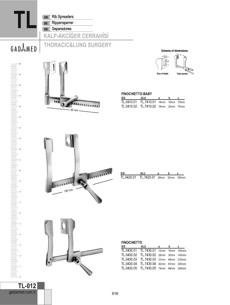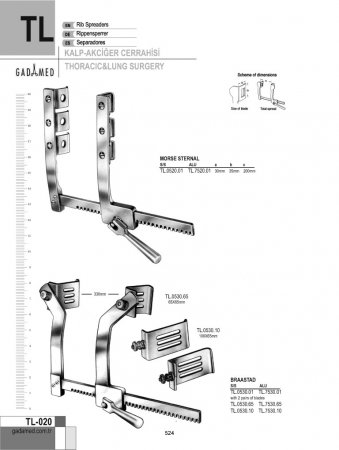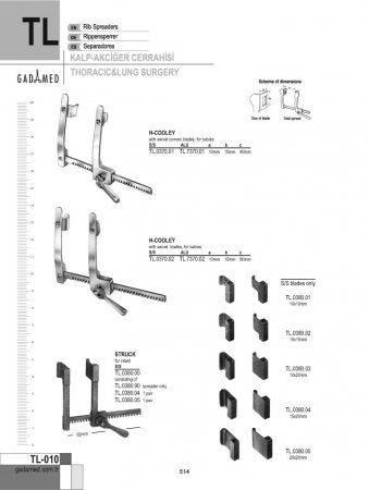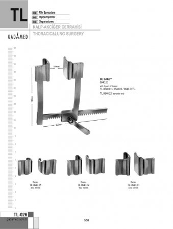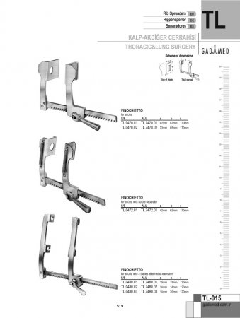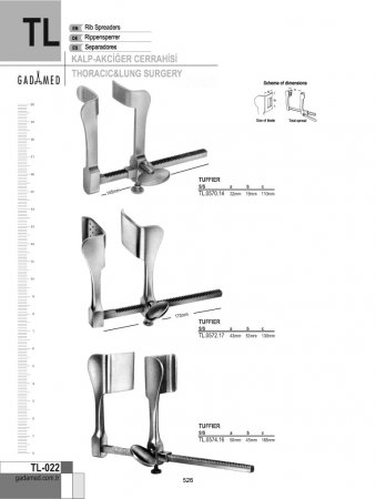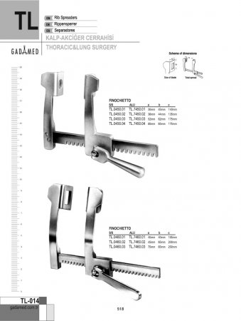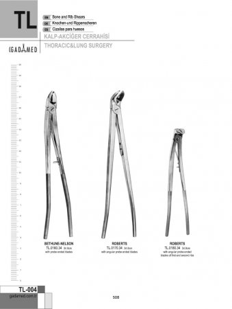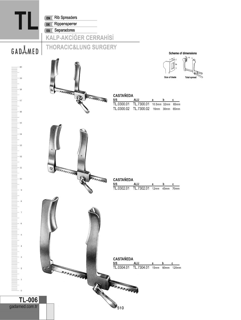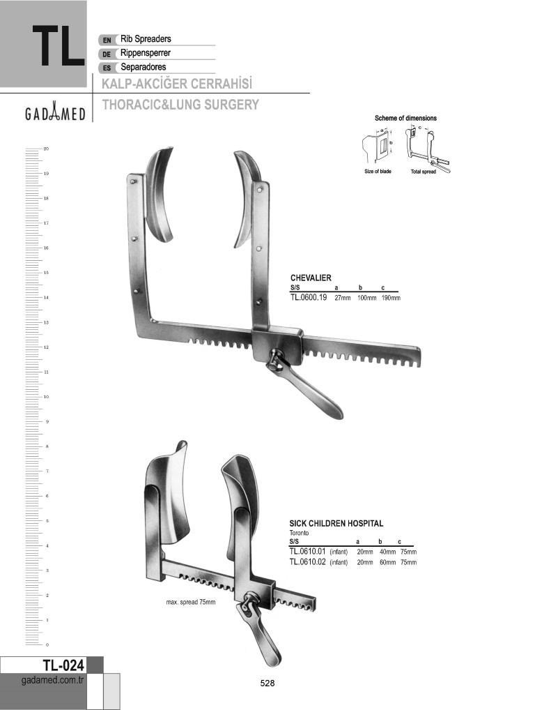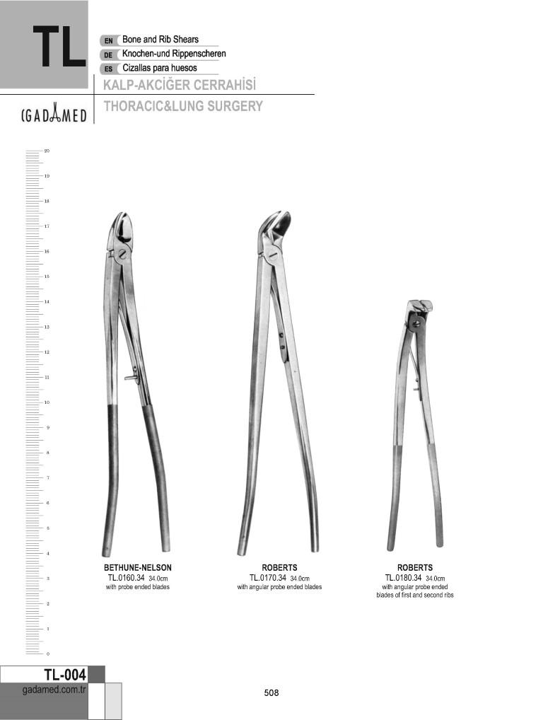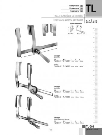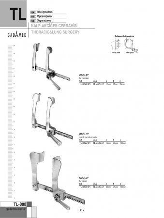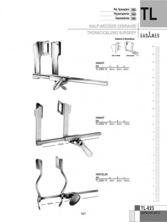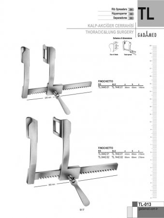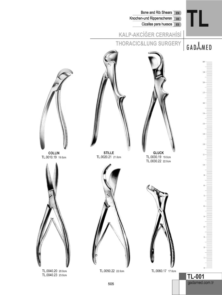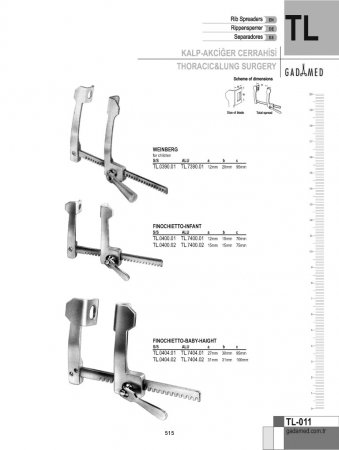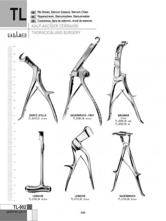 TL.0010.19 8681091059300 COLLIN KABURGA KESİCİ 19CM TL.0020.21 8681091059317 STILLE KABURGA KESİCİ 21CM TL.0030.19 8681091059324 GLUCK KABURGA KESİCİ 19CM TL.0030.22 8681091059331 GLUCK KABURGA KESİCİ 22CM TL.0040.20 8681091059348 YAYLI KEMİK ve KABURGA KESİCİ DÜZ 20CM TL.0040.23 8681091059355 YAYLI KEMİK ve KABURGA KESİCİ DÜZ 23CM TL.0050.22 8681091059362 KEMİK ve KABURGA KESİCİ 22CM TL.0060.17 8681091059379 SCHUCHARDT KABURGA KESİCİ 17CM TL.0070.27 8681091059386 GIERTZ-STILLE KABURGA KESİCİ 27CM TL.0080.36 8681091059393 SAUERBRUCH FREY KABURGA KESİCİ 36CM TL.0090.28 8681091059409 BRUNNER SAĞ EL İÇİN KABURGA KESİCİ 32CM TL.0092.28 8681091059416 BRUNNER SOL EL İÇİN KABURGA KESİCİ 32CM TL.0100.24 8681091059423 LEBSCHE STERNUM KESKİ 24.5CM TL.0110.25 8681091059430 LEBSCHE KABURGA KESİCİ 25CM TL.0120.26 8681091059447 SAUERBRUCH KABURGA KESİCİ YETİŞKİN 26CM TL.0130.35 8681091059454 CORYLLOS KABURGA KESİCİ 35CM TL.0132.35 8681091059461 CORYLLOS KABURGA KESİCİ 35CM TL.0140.34 8681091059478 BETHUNE KABURGA KESİCİ 34CM TL.0150.19 8681091059485 DOYEN KABURGA KESİCİ 19CM TL.0160.34 8681091059492 BETHUNE-NELSON KABURGA KESİCİ 34CM, PROB UÇLU TL.0170.34 8681091059508 ROBERTS KABURGA KESİCİ 34CM, AÇISAL PROB UÇLU TL.0180.34 8681091059515 ROBERTS KABURGA KESİCİ 34CM, AÇISAL PROB UÇLU TL.0190.21 8681091059522 SCHUMACHER/SAUERBRUCH STERNAM KESİCİ 21CM TL.0200.23 8681091059539 TUDOR ED+10712:10726WARD/VEHMEHREN KABURGA TUTUCU ve KOZTOTOM TL.0300.01 8681091059546 Castaneda Kaburga Ayırıcı 10.5x32mm, 65mm TL.0300.02 8681091059553 Castaneda Kaburga Ayırıcı 16x30mm, 65mm TL.0302.01 8681091059560 Castaneda Kaburga Ayırıcı 12x45mm, 70mm TL.0304.01 8681091059577 Castaneda Kaburga Ayırıcı 15x60mm, 120mm TL.0310.01 8681091059584 Cooley Kaburga Ayırıcı 12x13mm, 95mm TL.0310.02 8681091059591 Cooley Kaburga Ayırıcı 12x17mm, 75mm TL.0310.03 8681091059607 Cooley Kaburga Ayırıcı 14x16mm, 85mm TL.0312.01 8681091059614 Cooley Kaburga Ayırıcı 15x30mm, 115mm TL.0312.02 8681091059621 Cooley Kaburga Ayırıcı 15x30mm, 140mm TL.0312.03 8681091059638 Cooley Kaburga Ayırıcı 16x30mm, 105mm TL.0312.04 8681091059645 Cooley Kaburga Ayırıcı 20x45mm, 140mm TL.0312.05 8681091059652 Cooley Kaburga Ayırıcı 21x44mm, 150mm TL.0312.06 8681091059669 Cooley Kaburga Ayırıcı 30x35mm, 140mm TL.0314.01 8681091059676 Cooley Kaburga Ayırıcı 30x50mm, 185mm Alum. TL.0314.02 8681091059683 Cooley Kaburga Ayırıcı 35x50mm, 200mm Alum. TL.0314.03 8681091059690 Cooley Kaburga Ayırıcı 37x49mm, 200mm Alum. TL.0320.01 8681091059706 Cooley Neonatal için Kaburga Ayırıcı 12x15x70mm TL.0322.01 8681091059713 Cooley Kaburga çocuk 15x20x100mm TL.0330.01 8681091059720 Cooley Kaburga bebek 20x25x100mm TL.0340.01 8681091059737 Cooley Sternum Ayırıcı çocuk 21x45x145mm TL.0340.02 8681091059744 Cooley Sternum Ayırıcı yetişkin 32x50x190mm TL.0350.01 8681091059751 Cooley Kaburga Ayırıcı çocuk 35x100mm, 180mm TL.0350.02 8681091059768 Cooley Kaburga Ayırıcı yetişkin 35x115mm, 230mm TL.0360.01 8681091059775 Cooley Kaburga Ayırıcı yetişkin 35x100x180mm TL.0370.01 8681091059782 Cooley Kaburga bebek 10x15x90mm TL.0370.02 8681091059799 Cooley Kaburga bebek 10x15x90mm TL.0380.00 8681091059805 Struck Kaburga Ayırıcı infant set. 70x64x92mm TL.0380.01 8681091059812 Sadece Struck Ret. 10x10mm için bıçak, çift TL.0380.02 8681091059829 Sadece Struck Ret. 10x15mm için bıçak, çift TL.0380.03 8681091059836 Sadece Struck Ret. 10x20mm için bıçak, çift TL.0380.04 8681091059843 Sadece Struck Ret. 15x20mm için bıçak, çift TL.0380.05 8681091059850 Sadece Struck Ret. 20x20mm için bıçak, çift TL.0380.90 8681091059867 Sadece Struck Ekartör TL.0390.01 8681091059874 Weinberg Kaburga Ayırıcı çocuk 12x20x95mm TL.0400.01 8681091059881 Finochietto-İnfant Kaburga Ayırıcı 12x15x70mm TL.0400.02 8681091059898 Finochietto-İnfant Kaburga Ayırıcı 15x15x75mm TL.0404.01 8681091059904 Finochietto-Bebek-Haight Kaburga Ayırıcı 27x30x95mm TL.0404.02 8681091059911 Finochietto-Bebek-Haight Kaburga Ayırıcı 31x31x100mm TL.0410.01 8681091059928 Finochietto Bebek Kaburga Ayırıcı 14x15x75mm TL.0410.02 8681091059935 Finochietto Bebek Kaburga Ayırıcı 18x20x75mm TL.0420.01 8681091059942 Kaburga Ayırıcı 28x32mm, 120x140x180mm TL.0430.01 8681091059959 Finochietto Kaburga Ayırıcı 12x15mm, 100mm TL.0430.02 8681091059966 Finochietto Kaburga Ayırıcı 28x30mm, 143mm TL.0430.03 8681091059973 Finochietto Kaburga Ayırıcı 31x45mm, 210mm TL.0430.04 8681091059980 Finochietto Kaburga Ayırıcı 42x61mm, 245mm TL.0430.05 8681091059997 Finochietto Kaburga Ayırıcı 74x64mm, 245mm TL.0440.01 8681091060009 Finochietto Kaburga Ayırıcı 36x45mm, 140mm TL.0442.01 8681091060016 Finochietto Kaburga Ayırıcı 45x65mm, 210mm TL.0442.02 8681091060023 Finochietto Kaburga Ayırıcı 65x65mm, 210mm TL.0450.01 8681091060030 Finochietto Kaburga Ayırıcı 30x45mm, 140mm TL.0450.02 8681091060047 Finochietto Kaburga Ayırıcı 38x44mm, 135mm TL.0450.03 8681091060054 Finochietto Kaburga Ayırıcı 52x62mm, 175mm TL.0450.04 8681091060061 Finochietto Kaburga Ayırıcı 85x65mm, 175mm TL.0460.01 8681091060078 FINOCHIETTO Kaburga Ayırıcı 40x40x165mm TL.0460.02 8681091060085 FINOCHIETTO Kaburga Ayırıcı 45x65x200mm TL.0460.03 8681091060092 FINOCHIETTO Kaburga Ayırıcı 70x65x250mm TL.0470.01 8681091060108 Finochietto Ayırıcı tırtıklı 42x62x170mm TL.0470.02 8681091060115 Finochietto Ayırıcı tırtıklı 73x65x170mm TL.0472.01 8681091060122 Finochietto Kaburga Ayırıcı tırtıklı 42x62x170mm TL.0480.01 8681091060139 FINOCHIETTO Kaburga Ayırıcı 10x15x120mm TL.0480.02 8681091060146 FINOCHIETTO Kaburga Ayırıcı 14x14x120mm TL.0480.03 8681091060153 FINOCHIETTO Kaburga Ayırıcı 14x20x120mm TL.0490.00 8681091060160 FINOCHIETTO Kaburga Ayırıcı, 3 çift bıçaklı 15cm TL.0490.01 8681091060177 FINOCHIETTO Kaburga Ayırıcı sadece küçük, 15cm TL.0490