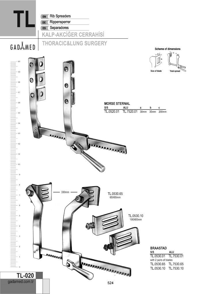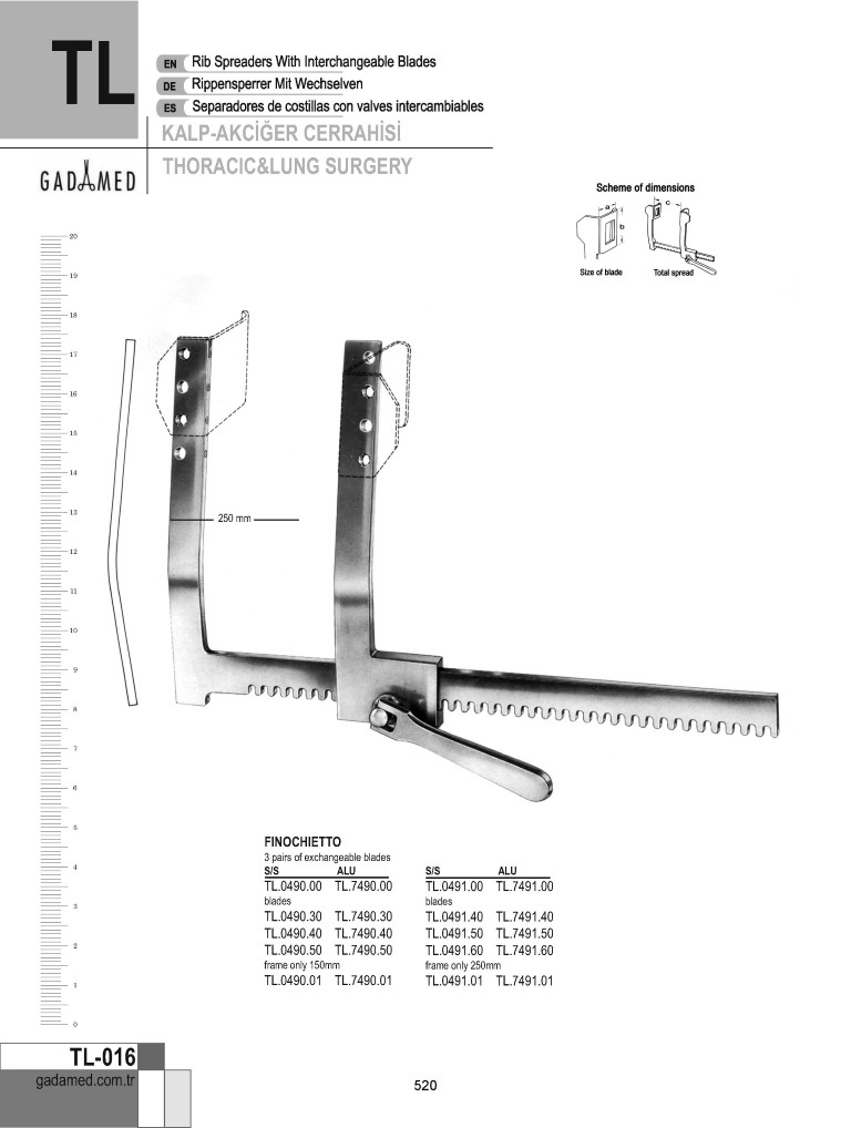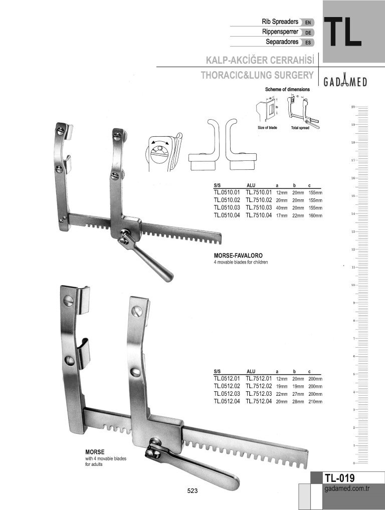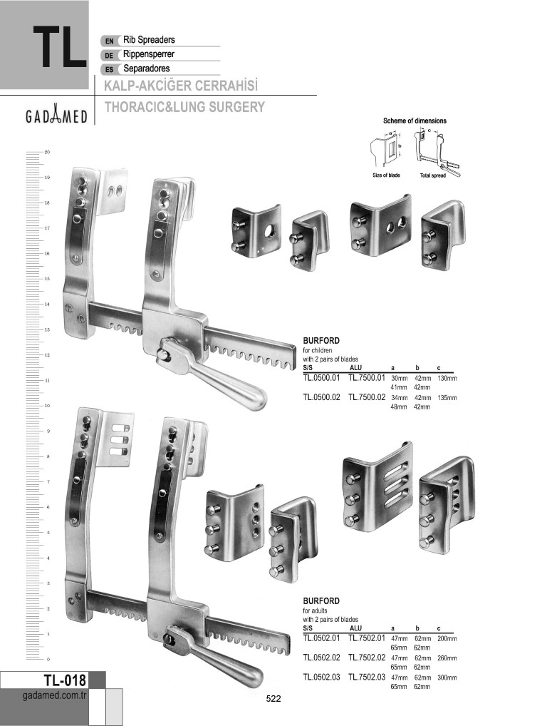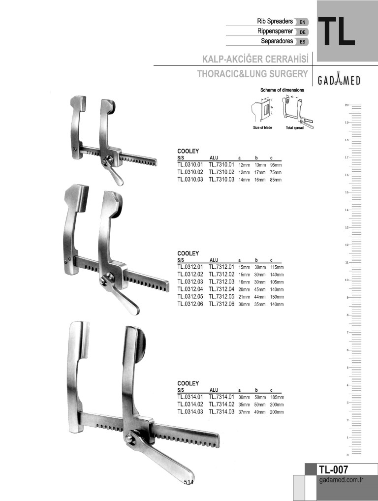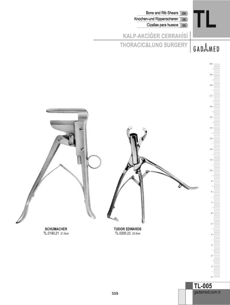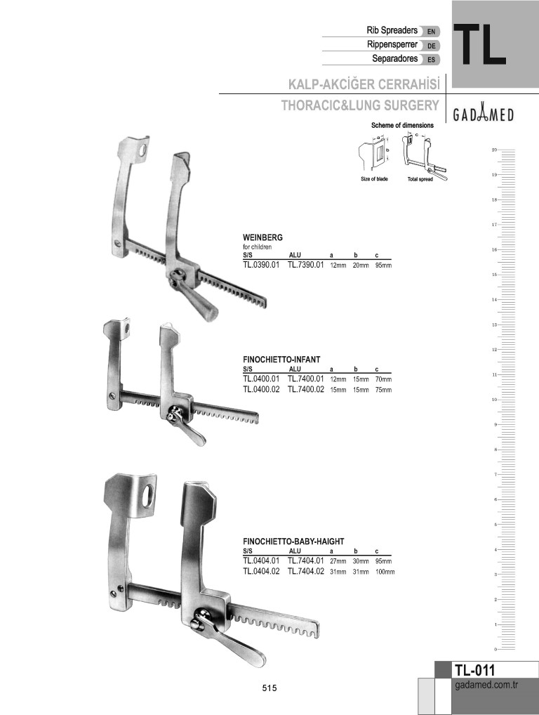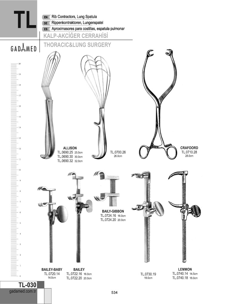 TL.0010.19 8681091059300 COLLIN KABURGA KESİCİ 19CM TL.0020.21 8681091059317 STILLE KABURGA KESİCİ 21CM TL.0030.19 8681091059324 GLUCK KABURGA KESİCİ 19CM TL.0030.22 8681091059331 GLUCK KABURGA KESİCİ 22CM TL.0040.20 8681091059348 YAYLI KEMİK ve KABURGA KESİCİ DÜZ 20CM TL.0040.23 8681091059355 YAYLI KEMİK ve KABURGA KESİCİ DÜZ 23CM TL.0050.22 8681091059362 KEMİK ve KABURGA KESİCİ 22CM TL.0060.17 8681091059379 SCHUCHARDT KABURGA KESİCİ 17CM TL.0070.27 8681091059386 GIERTZ-STILLE KABURGA KESİCİ 27CM TL.0080.36 8681091059393 SAUERBRUCH FREY KABURGA KESİCİ 36CM TL.0090.28 8681091059409 BRUNNER SAĞ EL İÇİN KABURGA KESİCİ 32CM TL.0092.28 8681091059416 BRUNNER SOL EL İÇİN KABURGA KESİCİ 32CM TL.0100.24 8681091059423 LEBSCHE STERNUM KESKİ 24.5CM TL.0110.25 8681091059430 LEBSCHE KABURGA KESİCİ 25CM TL.0120.26 8681091059447 SAUERBRUCH KABURGA KESİCİ YETİŞKİN 26CM TL.0130.35 8681091059454 CORYLLOS KABURGA KESİCİ 35CM TL.0132.35 8681091059461 CORYLLOS KABURGA KESİCİ 35CM TL.0140.34 8681091059478 BETHUNE KABURGA KESİCİ 34CM TL.0150.19 8681091059485 DOYEN KABURGA KESİCİ 19CM TL.0160.34 8681091059492 BETHUNE-NELSON KABURGA KESİCİ 34CM, PROB UÇLU TL.0170.34 8681091059508 ROBERTS KABURGA KESİCİ 34CM, AÇISAL PROB UÇLU TL.0180.34 8681091059515 ROBERTS KABURGA KESİCİ 34CM, AÇISAL PROB UÇLU TL.0190.21 8681091059522 SCHUMACHER/SAUERBRUCH STERNAM KESİCİ 21CM TL.0200.23 8681091059539 TUDOR ED+10712:10726WARD/VEHMEHREN KABURGA TUTUCU ve KOZTOTOM TL.0300.01 8681091059546 Castaneda Kaburga Ayırıcı 10.5x32mm, 65mm TL.0300.02 8681091059553 Castaneda Kaburga Ayırıcı 16x30mm, 65mm TL.0302.01 8681091059560 Castaneda Kaburga Ayırıcı 12x45mm, 70mm TL.0304.01 8681091059577 Castaneda Kaburga Ayırıcı 15x60mm, 120mm TL.0310.01 8681091059584 Cooley Kaburga Ayırıcı 12x13mm, 95mm TL.0310.02 8681091059591 Cooley Kaburga Ayırıcı 12x17mm, 75mm TL.0310.03 8681091059607 Cooley Kaburga Ayırıcı 14x16mm, 85mm TL.0312.01 8681091059614 Cooley Kaburga Ayırıcı 15x30mm, 115mm TL.0312.02 8681091059621 Cooley Kaburga Ayırıcı 15x30mm, 140mm TL.0312.03 8681091059638 Cooley Kaburga Ayırıcı 16x30mm, 105mm TL.0312.04 8681091059645 Cooley Kaburga Ayırıcı 20x45mm, 140mm TL.0312.05 8681091059652 Cooley Kaburga Ayırıcı 21x44mm, 150mm TL.0312.06 8681091059669 Cooley Kaburga Ayırıcı 30x35mm, 140mm TL.0314.01 8681091059676 Cooley Kaburga Ayırıcı 30x50mm, 185mm Alum. TL.0314.02 8681091059683 Cooley Kaburga Ayırıcı 35x50mm, 200mm Alum. TL.0314.03 8681091059690 Cooley Kaburga Ayırıcı 37x49mm, 200mm Alum. TL.0320.01 8681091059706 Cooley Neonatal için Kaburga Ayırıcı 12x15x70mm TL.0322.01 8681091059713 Cooley Kaburga çocuk 15x20x100mm TL.0330.01 8681091059720 Cooley Kaburga bebek 20x25x100mm TL.0340.01 8681091059737 Cooley Sternum Ayırıcı çocuk 21x45x145mm TL.0340.02 8681091059744 Cooley Sternum Ayırıcı yetişkin 32x50x190mm TL.0350.01 8681091059751 Cooley Kaburga Ayırıcı çocuk 35x100mm, 180mm TL.0350.02 8681091059768 Cooley Kaburga Ayırıcı yetişkin 35x115mm, 230mm TL.0360.01 8681091059775 Cooley Kaburga Ayırıcı yetişkin 35x100x180mm TL.0370.01 8681091059782 Cooley Kaburga bebek 10x15x90mm TL.0370.02 8681091059799 Cooley Kaburga bebek 10x15x90mm TL.0380.00 8681091059805 Struck Kaburga Ayırıcı infant set. 70x64x92mm TL.0380.01 8681091059812 Sadece Struck Ret. 10x10mm için bıçak, çift TL.0380.02 8681091059829 Sadece Struck Ret. 10x15mm için bıçak, çift TL.0380.03 8681091059836 Sadece Struck Ret. 10x20mm için bıçak, çift TL.0380.04 8681091059843 Sadece Struck Ret. 15x20mm için bıçak, çift TL.0380.05 8681091059850 Sadece Struck Ret. 20x20mm için bıçak, çift TL.0380.90 8681091059867 Sadece Struck Ekartör TL.0390.01 8681091059874 Weinberg Kaburga Ayırıcı çocuk 12x20x95mm TL.0400.01 8681091059881 Finochietto-İnfant Kaburga Ayırıcı 12x15x70mm TL.0400.02 8681091059898 Finochietto-İnfant Kaburga Ayırıcı 15x15x75mm TL.0404.01 8681091059904 Finochietto-Bebek-Haight Kaburga Ayırıcı 27x30x95mm TL.0404.02 8681091059911 Finochietto-Bebek-Haight Kaburga Ayırıcı 31x31x100mm TL.0410.01 8681091059928 Finochietto Bebek Kaburga Ayırıcı 14x15x75mm TL.0410.02 8681091059935 Finochietto Bebek Kaburga Ayırıcı 18x20x75mm TL.0420.01 8681091059942 Kaburga Ayırıcı 28x32mm, 120x140x180mm TL.0430.01 8681091059959 Finochietto Kaburga Ayırıcı 12x15mm, 100mm TL.0430.02 8681091059966 Finochietto Kaburga Ayırıcı 28x30mm, 143mm TL.0430.03 8681091059973 Finochietto Kaburga Ayırıcı 31x45mm, 210mm TL.0430.04 8681091059980 Finochietto Kaburga Ayırıcı 42x61mm, 245mm TL.0430.05 8681091059997 Finochietto Kaburga Ayırıcı 74x64mm, 245mm TL.0440.01 8681091060009 Finochietto Kaburga Ayırıcı 36x45mm, 140mm TL.0442.01 8681091060016 Finochietto Kaburga Ayırıcı 45x65mm, 210mm TL.0442.02 8681091060023 Finochietto Kaburga Ayırıcı 65x65mm, 210mm TL.0450.01 8681091060030 Finochietto Kaburga Ayırıcı 30x45mm, 140mm TL.0450.02 8681091060047 Finochietto Kaburga Ayırıcı 38x44mm, 135mm TL.0450.03 8681091060054 Finochietto Kaburga Ayırıcı 52x62mm, 175mm TL.0450.04 8681091060061 Finochietto Kaburga Ayırıcı 85x65mm, 175mm TL.0460.01 8681091060078 FINOCHIETTO Kaburga Ayırıcı 40x40x165mm TL.0460.02 8681091060085 FINOCHIETTO Kaburga Ayırıcı 45x65x200mm TL.0460.03 8681091060092 FINOCHIETTO Kaburga Ayırıcı 70x65x250mm TL.0470.01 8681091060108 Finochietto Ayırıcı tırtıklı 42x62x170mm TL.0470.02 8681091060115 Finochietto Ayırıcı tırtıklı 73x65x170mm TL.0472.01 8681091060122 Finochietto Kaburga Ayırıcı tırtıklı 42x62x170mm TL.0480.01 8681091060139 FINOCHIETTO Kaburga Ayırıcı 10x15x120mm TL.0480.02 8681091060146 FINOCHIETTO Kaburga Ayırıcı 14x14x120mm TL.0480.03 8681091060153 FINOCHIETTO Kaburga Ayırıcı 14x20x120mm TL.0490.00 8681091060160 FINOCHIETTO Kaburga Ayırıcı, 3 çift bıçaklı 15cm TL.0490.01 8681091060177 FINOCHIETTO Kaburga Ayırıcı sadece küçük, 15cm TL.0490