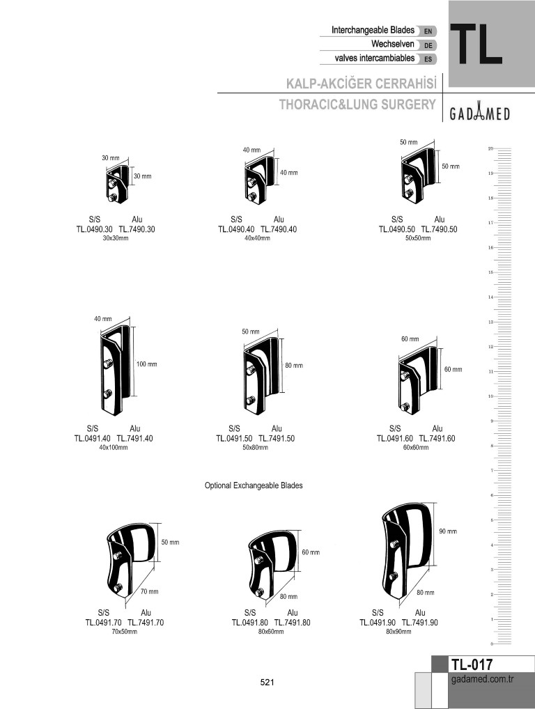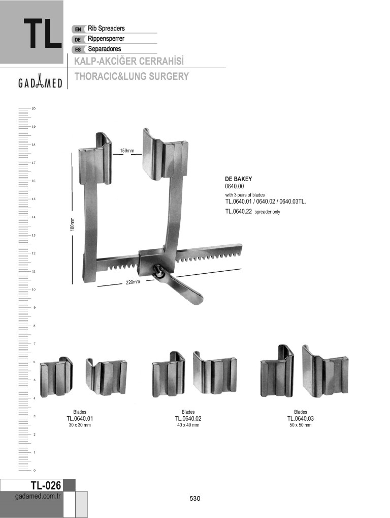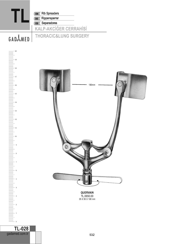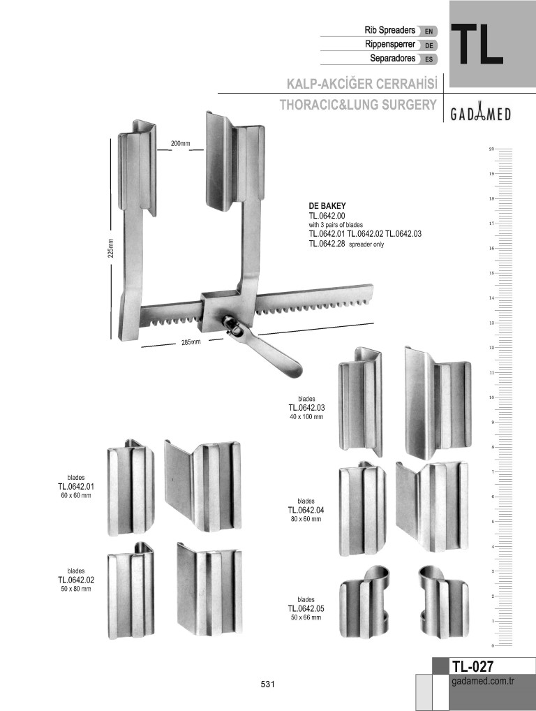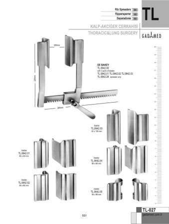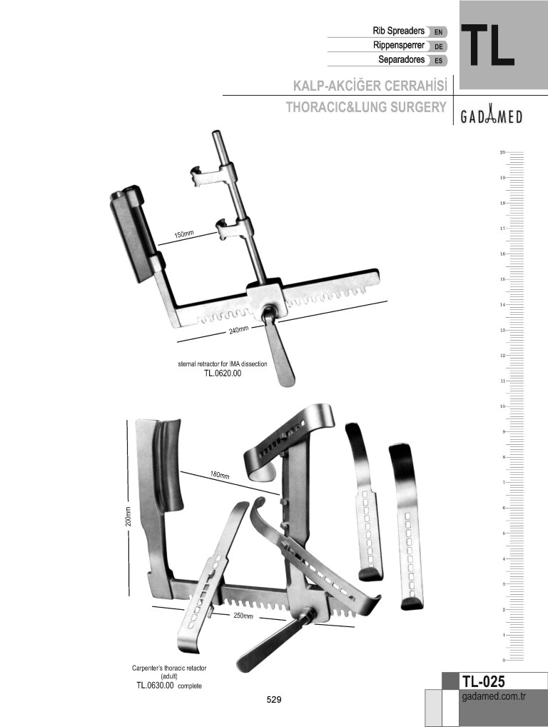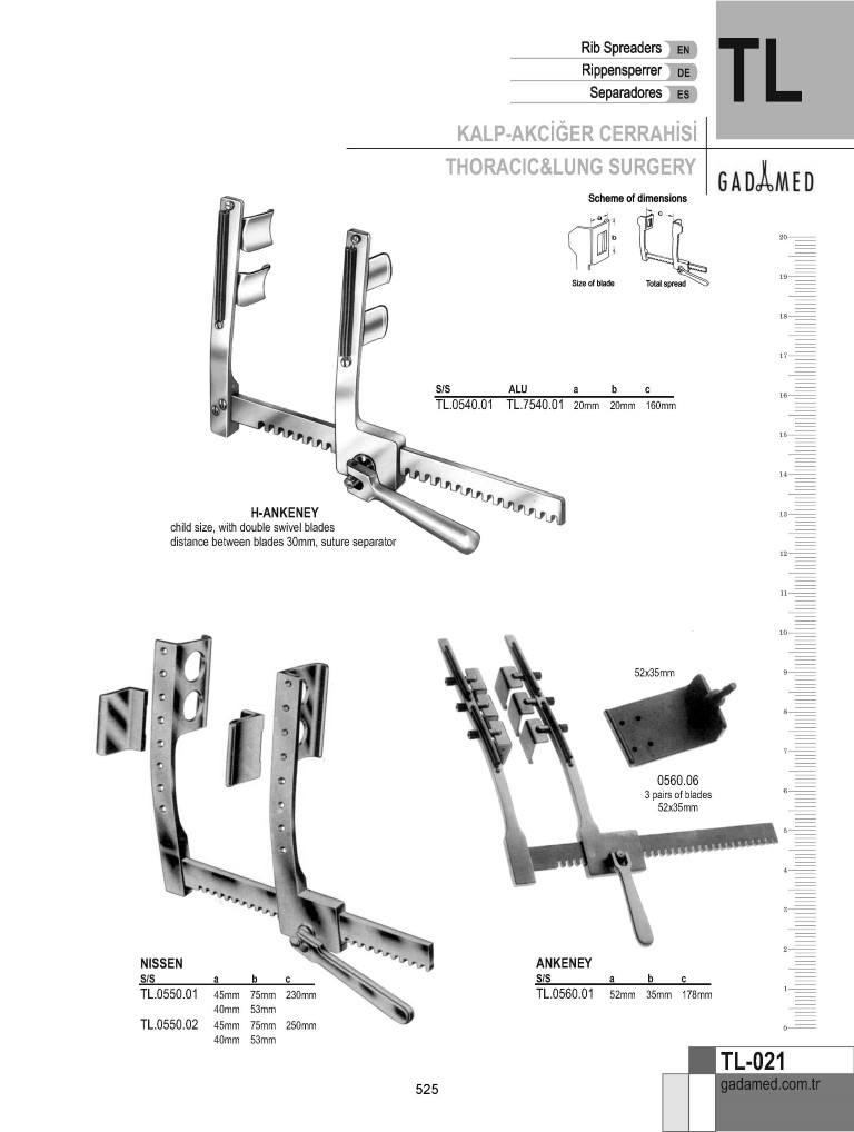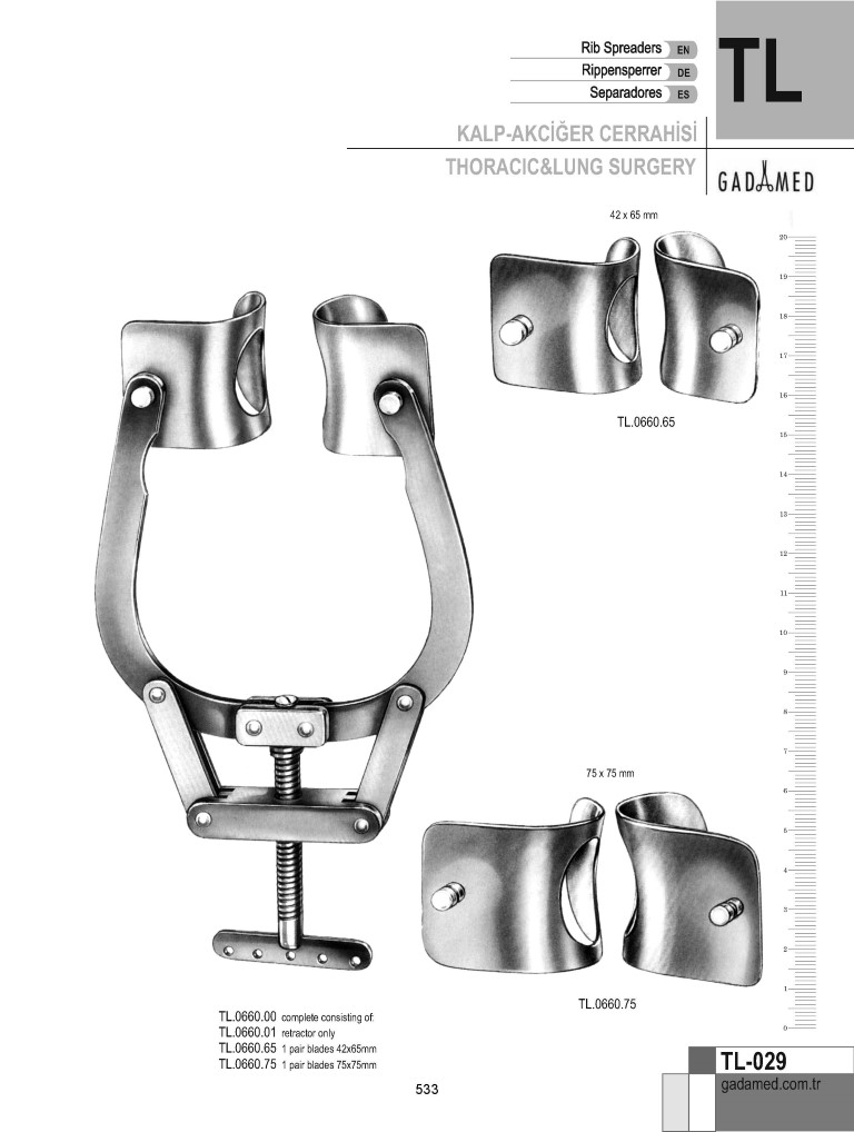 TL.0010.19 8681091059300 COLLIN KABURGA KESİCİ 19CM TL.0020.21 8681091059317 STILLE KABURGA KESİCİ 21CM TL.0030.19 8681091059324 GLUCK KABURGA KESİCİ 19CM TL.0030.22 8681091059331 GLUCK KABURGA KESİCİ 22CM TL.0040.20 8681091059348 YAYLI KEMİK ve KABURGA KESİCİ DÜZ 20CM TL.0040.23 8681091059355 YAYLI KEMİK ve KABURGA KESİCİ DÜZ 23CM TL.0050.22 8681091059362 KEMİK ve KABURGA KESİCİ 22CM TL.0060.17 8681091059379 SCHUCHARDT KABURGA KESİCİ 17CM TL.0070.27 8681091059386 GIERTZ-STILLE KABURGA KESİCİ 27CM TL.0080.36 8681091059393 SAUERBRUCH FREY KABURGA KESİCİ 36CM TL.0090.28 8681091059409 BRUNNER SAĞ EL İÇİN KABURGA KESİCİ 32CM TL.0092.28 8681091059416 BRUNNER SOL EL İÇİN KABURGA KESİCİ 32CM TL.0100.24 8681091059423 LEBSCHE STERNUM KESKİ 24.5CM TL.0110.25 8681091059430 LEBSCHE KABURGA KESİCİ 25CM TL.0120.26 8681091059447 SAUERBRUCH KABURGA KESİCİ YETİŞKİN 26CM TL.0130.35 8681091059454 CORYLLOS KABURGA KESİCİ 35CM TL.0132.35 8681091059461 CORYLLOS KABURGA KESİCİ 35CM TL.0140.34 8681091059478 BETHUNE KABURGA KESİCİ 34CM TL.0150.19 8681091059485 DOYEN KABURGA KESİCİ 19CM TL.0160.34 8681091059492 BETHUNE-NELSON KABURGA KESİCİ 34CM, PROB UÇLU TL.0170.34 8681091059508 ROBERTS KABURGA KESİCİ 34CM, AÇISAL PROB UÇLU TL.0180.34 8681091059515 ROBERTS KABURGA KESİCİ 34CM, AÇISAL PROB UÇLU TL.0190.21 8681091059522 SCHUMACHER/SAUERBRUCH STERNAM KESİCİ 21CM TL.0200.23 8681091059539 TUDOR ED+10712:10726WARD/VEHMEHREN KABURGA TUTUCU ve KOZTOTOM TL.0300.01 8681091059546 Castaneda Kaburga Ayırıcı 10.5x32mm, 65mm TL.0300.02 8681091059553 Castaneda Kaburga Ayırıcı 16x30mm, 65mm TL.0302.01 8681091059560 Castaneda Kaburga Ayırıcı 12x45mm, 70mm TL.0304.01 8681091059577 Castaneda Kaburga Ayırıcı 15x60mm, 120mm TL.0310.01 8681091059584 Cooley Kaburga Ayırıcı 12x13mm, 95mm TL.0310.02 8681091059591 Cooley Kaburga Ayırıcı 12x17mm, 75mm TL.0310.03 8681091059607 Cooley Kaburga Ayırıcı 14x16mm, 85mm TL.0312.01 8681091059614 Cooley Kaburga Ayırıcı 15x30mm, 115mm TL.0312.02 8681091059621 Cooley Kaburga Ayırıcı 15x30mm, 140mm TL.0312.03 8681091059638 Cooley Kaburga Ayırıcı 16x30mm, 105mm TL.0312.04 8681091059645 Cooley Kaburga Ayırıcı 20x45mm, 140mm TL.0312.05 8681091059652 Cooley Kaburga Ayırıcı 21x44mm, 150mm TL.0312.06 8681091059669 Cooley Kaburga Ayırıcı 30x35mm, 140mm TL.0314.01 8681091059676 Cooley Kaburga Ayırıcı 30x50mm, 185mm Alum. TL.0314.02 8681091059683 Cooley Kaburga Ayırıcı 35x50mm, 200mm Alum. TL.0314.03 8681091059690 Cooley Kaburga Ayırıcı 37x49mm, 200mm Alum. TL.0320.01 8681091059706 Cooley Neonatal için Kaburga Ayırıcı 12x15x70mm TL.0322.01 8681091059713 Cooley Kaburga çocuk 15x20x100mm TL.0330.01 8681091059720 Cooley Kaburga bebek 20x25x100mm TL.0340.01 8681091059737 Cooley Sternum Ayırıcı çocuk 21x45x145mm TL.0340.02 8681091059744 Cooley Sternum Ayırıcı yetişkin 32x50x190mm TL.0350.01 8681091059751 Cooley Kaburga Ayırıcı çocuk 35x100mm, 180mm TL.0350.02 8681091059768 Cooley Kaburga Ayırıcı yetişkin 35x115mm, 230mm TL.0360.01 8681091059775 Cooley Kaburga Ayırıcı yetişkin 35x100x180mm TL.0370.01 8681091059782 Cooley Kaburga bebek 10x15x90mm TL.0370.02 8681091059799 Cooley Kaburga bebek 10x15x90mm TL.0380.00 8681091059805 Struck Kaburga Ayırıcı infant set. 70x64x92mm TL.0380.01 8681091059812 Sadece Struck Ret. 10x10mm için bıçak, çift TL.0380.02 8681091059829 Sadece Struck Ret. 10x15mm için bıçak, çift TL.0380.03 8681091059836 Sadece Struck Ret. 10x20mm için bıçak, çift TL.0380.04 8681091059843 Sadece Struck Ret. 15x20mm için bıçak, çift TL.0380.05 8681091059850 Sadece Struck Ret. 20x20mm için bıçak, çift TL.0380.90 8681091059867 Sadece Struck Ekartör TL.0390.01 8681091059874 Weinberg Kaburga Ayırıcı çocuk 12x20x95mm TL.0400.01 8681091059881 Finochietto-İnfant Kaburga Ayırıcı 12x15x70mm TL.0400.02 8681091059898 Finochietto-İnfant Kaburga Ayırıcı 15x15x75mm TL.0404.01 8681091059904 Finochietto-Bebek-Haight Kaburga Ayırıcı 27x30x95mm TL.0404.02 8681091059911 Finochietto-Bebek-Haight Kaburga Ayırıcı 31x31x100mm TL.0410.01 8681091059928 Finochietto Bebek Kaburga Ayırıcı 14x15x75mm TL.0410.02 8681091059935 Finochietto Bebek Kaburga Ayırıcı 18x20x75mm TL.0420.01 8681091059942 Kaburga Ayırıcı 28x32mm, 120x140x180mm TL.0430.01 8681091059959 Finochietto Kaburga Ayırıcı 12x15mm, 100mm TL.0430.02 8681091059966 Finochietto Kaburga Ayırıcı 28x30mm, 143mm TL.0430.03 8681091059973 Finochietto Kaburga Ayırıcı 31x45mm, 210mm TL.0430.04 8681091059980 Finochietto Kaburga Ayırıcı 42x61mm, 245mm TL.0430.05 8681091059997 Finochietto Kaburga Ayırıcı 74x64mm, 245mm TL.0440.01 8681091060009 Finochietto Kaburga Ayırıcı 36x45mm, 140mm TL.0442.01 8681091060016 Finochietto Kaburga Ayırıcı 45x65mm, 210mm TL.0442.02 8681091060023 Finochietto Kaburga Ayırıcı 65x65mm, 210mm TL.0450.01 8681091060030 Finochietto Kaburga Ayırıcı 30x45mm, 140mm TL.0450.02 8681091060047 Finochietto Kaburga Ayırıcı 38x44mm, 135mm TL.0450.03 8681091060054 Finochietto Kaburga Ayırıcı 52x62mm, 175mm TL.0450.04 8681091060061 Finochietto Kaburga Ayırıcı 85x65mm, 175mm TL.0460.01 8681091060078 FINOCHIETTO Kaburga Ayırıcı 40x40x165mm TL.0460.02 8681091060085 FINOCHIETTO Kaburga Ayırıcı 45x65x200mm TL.0460.03 8681091060092 FINOCHIETTO Kaburga Ayırıcı 70x65x250mm TL.0470.01 8681091060108 Finochietto Ayırıcı tırtıklı 42x62x170mm TL.0470.02 8681091060115 Finochietto Ayırıcı tırtıklı 73x65x170mm TL.0472.01 8681091060122 Finochietto Kaburga Ayırıcı tırtıklı 42x62x170mm TL.0480.01 8681091060139 FINOCHIETTO Kaburga Ayırıcı 10x15x120mm TL.0480.02 8681091060146 FINOCHIETTO Kaburga Ayırıcı 14x14x120mm TL.0480.03 8681091060153 FINOCHIETTO Kaburga Ayırıcı 14x20x120mm TL.0490.00 8681091060160 FINOCHIETTO Kaburga Ayırıcı, 3 çift bıçaklı 15cm TL.0490.01 8681091060177 FINOCHIETTO Kaburga Ayırıcı sadece küçük, 15cm TL.0490