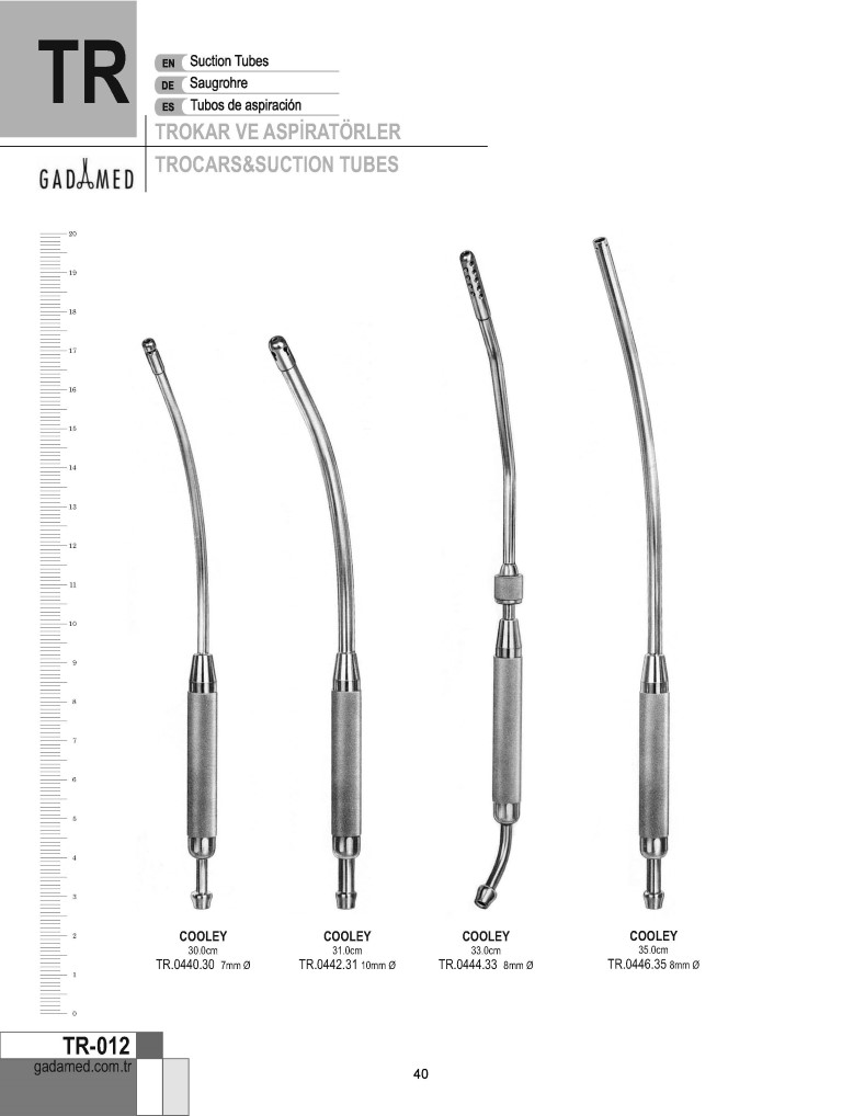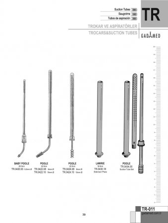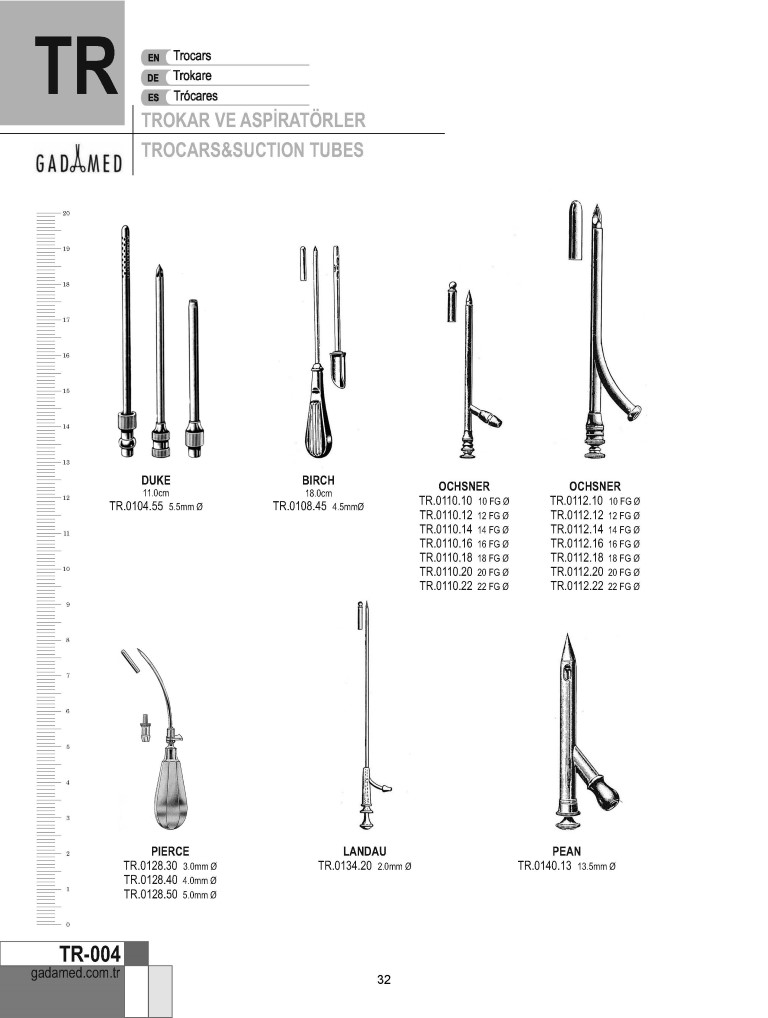TR.0010.03 8681091003051 Trokar, universal model 3 bıçak, 1 tutamaç set w TR.0010.04 8681091003068 Trokar, universal model 4 bıçak 1 tutamaç set w TR.0016.03 8681091003075 Trokar, universal model 3 bıçak, 1 tutamaç set F TR.0016.04 8681091003082 Trokar, universal model 4 bıçak 1 tutamaç set F TR.0022.08 8681091003099 Trokar, Hydrocele model 8FG 12 cm TR.0022.09 8681091003105 Trokar, Hydrocele model 9FG 12 cm TR.0022.10 8681091003112 Trokar, Hydrocele model 10FG 12 cm TR.0028.16 8681091003129 Trokar, Ascites model 16FG 15 cm TR.0028.21 8681091003136 Trokar, Ascites model 21FG 15 cm TR.0034.08 8681091003143 Trokar, Exploring model 8FG TR.0040.30 8681091003150 Trokar, Krause model 3,0 mm TR.0040.40 8681091003167 Trokar, Krause model 4,0 mm TR.0040.50 8681091003174 Trokar, Krause model 5,0 mm TR.0040.55 8681091003181 Trokar, Krause model 5,5 mm TR.0048.25 8681091003198 Trokar, Nelson model 25 FG 21 cm fig.1 TR.0048.30 8681091003204 Trokar, Nelson model 30 FG 21 cm fig.2 TR.0048.33 8681091003211 Trokar, Nelson model 33 FG 21 cm fig.3 TR.0048.35 8681091003228 Trokar, Nelson model 35 FG 21 cm fig.4 TR.0056.90 8681091003235 Trocar, Johansson model 9mm 18 cm TR.0060.50 8681091003242 Trocar, Billroth model 5 mm 24 cm TR.0060.60 8681091003259 Trocar, Billroth model 6 mm 24 cm TR.0066.80 8681091003266 Trocar, Buelau model 8mm 24 cm TR.0074.50 8681091003273 Trocar, Fleurant model 5 mm TR.0080.50 8681091003280 Trocar, Fleurant model 5 mm 23 cm TR.0090.30 8681091003297 Trokar standart 3 mm 11 cm TR.0090.35 8681091003303 Trokar standart 3.5 mm 11 cm TR.0090.40 8681091003310 Trokar standart 4 mm 11 cm TR.0090.45 8681091003327 Trokar standart 4.5 mm 11 cm TR.0090.50 8681091003334 Trokar standart 5 mm 11 cm TR.0090.55 8681091003341 Trokar standart 5.5 mm 11 cm TR.0090.60 8681091003358 Trokar standart 6 mm 11 cm TR.0094.30 8681091003365 Trokar standart musluklu 3 mm 11 cm TR.0094.35 8681091003372 Trokar standart musluklu 3.5 mm 11 cm TR.0094.40 8681091003389 Trokar standart musluklu 4 mm 11 cm TR.0094.45 8681091003396 Trokar standart musluklu 4.5 mm 11 cm TR.0094.50 8681091003402 Trokar standart musluklu 5 mm 11 cm TR.0094.55 8681091003419 Trokar standart musluklu 5.5 mm 11 cm TR.0094.60 8681091003426 Trokar standart musluklu 6 mm 11 cm TR.0098.30 8681091003433 Trokar standart w/musluklu 3 mm 11 cm TR.0098.35 8681091003440 Trokar standart w/musluklu 3.5 mm 11 cm TR.0098.40 8681091003457 Trokar standart w/musluklu 4 mm 11 cm TR.0098.45 8681091003464 Trokar standart w/musluklu 4.5 mm 11 cm TR.0098.50 8681091003471 Trokar standart w/musluklu 5 mm 11 cm TR.0098.55 8681091003488 Trokar standart w/musluklu 5.5 mm 11 cm TR.0098.60 8681091003495 Trokar standart w/musluklu 6 mm 11 cm TR.0104.55 8681090987291 Duke Trokar ve Kanül Ø 5.5mm, 11 cm TR.0108.45 8681091003518 Trokar, Birch model 4.5 18 cm TR.0110.10 8681091003525 Trokar, kanül, Ochsner model 10 FG TR.0110.12 8681091003532 Trokar, kanül, Ochsner model 12 FG TR.0110.14 8681091003549 Trokar, kanül, Ochsner model 14 FG TR.0110.16 8681091003556 Trokar, kanül, Ochsner model 16 FG TR.0110.18 8681091003563 Trokar, kanül, Ochsner model 18 FG TR.0110.20 8681091003570 Trokar, kanül, Ochsner model 20 FG TR.0110.22 8681091003587 Trokar, kanül, Ochsner model 22 FG TR.0112.10 8681091003594 Trokar, kanül, toraks Ochsner model 10 FG TR.0112.12 8681091003600 Trokar, kanül, toraks Ochsner model 12 FG TR.0112.14 8681091003617 Trokar, kanül, toraks Ochsner model 14 FG TR.0112.16 8681091003624 Trokar, kanül, toraks Ochsner model 16 FG TR.0112.18 8681091003631 Trokar, kanül, toraks Ochsner model 18 FG TR.0112.20 8681091003648 Trokar, kanül, toraks Ochsner model 20 FG TR.0112.22 8681091003655 Trokar, kanül, toraks Ochsner model 22 FG TR.0128.30 8681091003662 Trokar, antrum pierce model 3.0 mm TR.0128.40 8681091003679 Trokar, antrum pierce model 4.0 mm TR.0128.50 8681091003686 Trokar, antrum pierce model 5.0 mm TR.0134.20 8681091003693 Trokar, Landau model 2.0 mm TR.0140.13 8681091003709 Trokar, Pean model 13.5 cm TR.0146.20 8681091003716 Trokar,düz antrum ruskin model 2.0 mm TR.0148.20 8681091003723 Trokar,eğri antrum ruskin model 2.0 mm TR.0156.18 8681091003730 Trokar, antrum eicken model 1.8 mm 10.5 cm TR.0156.20 8681091003747 Trokar, antrum eicken model 2.0 mm 10.5 cm TR.0156.30 8681091003754 Trokar, antrum eicken model 3.0 mm 10.5 cm TR.0162.30 8681091003761 Trokar, Douglas model 3.0 mm TR.0166.22 8681091003778 Trokar, Coakley model 2.25 mm TR.0170.12 8681091003785 Trokar, Lichtwitz model 1.25 mm TR.0170.15 8681091003792 Trokar, Lichtwitz model 1.50 mm TR.0170.18 8681091003808 Trokar, Lichtwitz model 1.80 mm TR.0176.30 8681091003815 İrrigasyon kanülü, 3mm 15 cm TR.0176.40 8681091003822 İrrigasyon kanülü, 4mm 15 cm TR.0176.50 8681091003839 İrrigasyon kanülü, 5mm 15 cm TR.0176.60 8681091003846 İrrigasyon kanülü, 6mm 15 cm TR.0182.14 8681091003853 Anestezi iğnesi, İowa model 14 cm TR.0190.08 8681091003860 Klavuz iğne, 8Fr 15 cm TR.0190.10 8681091003877 Klavuz iğne, 10Fr 15 cm TR.0190.12 8681091003884 Klavuz iğne, 12Fr 15 cm TR.0190.14 8681091003891 Klavuz iğne, 14Fr 15 cm TR.0190.16 8681091003907 Klavuz iğne, 16Fr 15 cm TR.0190.18 8681091003914 Klavuz iğne, 18Fr 15 cm TR.0192.08 8681091003921 Klavuz iğne, Lancet tip 8Fr 15 cm TR.0192.10 8681091003938 Klavuz iğne, Lancet tip 10Fr 15 cm TR.0192.12 8681091003945 Klavuz iğne, Lancet tip 12Fr 15 cm TR.0192.14 8681091003952 Klavuz iğne, Lancet tip 14Fr 15 cm TR.0192.16 8681091003969 Klavuz iğne, Lancet tip 16Fr 15 cm TR.0192.18 8681091003976 Klavuz iğne, Lancet tip 18Fr 15 cm TR.0194.08 8681091003983 Klavuz iğne, Cclosure tip 8Fr 15 cm TR.0194.10 8681091003990 Klavuz iğne, Cclosure 10Fr 15 cm TR.0194.12 8681091004003 Klavuz iğne, Cclosure 12Fr 15 cm TR.0194.14 8681091004010 Klavuz iğne, Cclosure 14Fr 15 cm TR.0194.16 8681091004027 Klavuz iğne, Cclosure 16Fr 15 cm TR.0194.18 8681091004034 Klavuz iğne, LCclosure 18Fr 15 cm TR.0202.10 8681091004041 Veres iğnesi, 2x100 mm TR.02